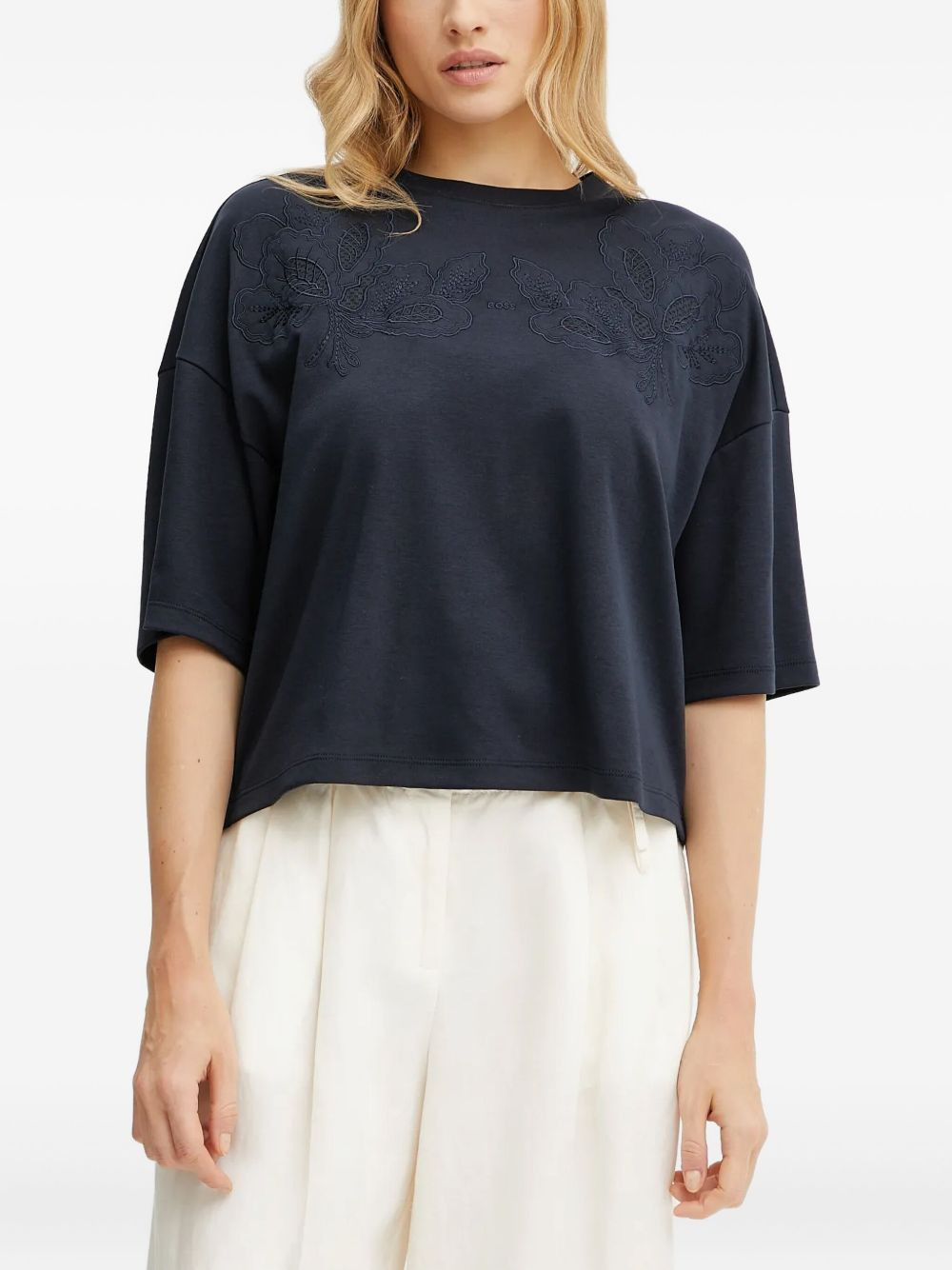 floral-embroidered T-shirt Highlights - Dark blue - Embroidered floral detail - Short sleeves - Crew neck Imported Composition Fabric 100% Washing instructions Read Manufacturer Guidelines