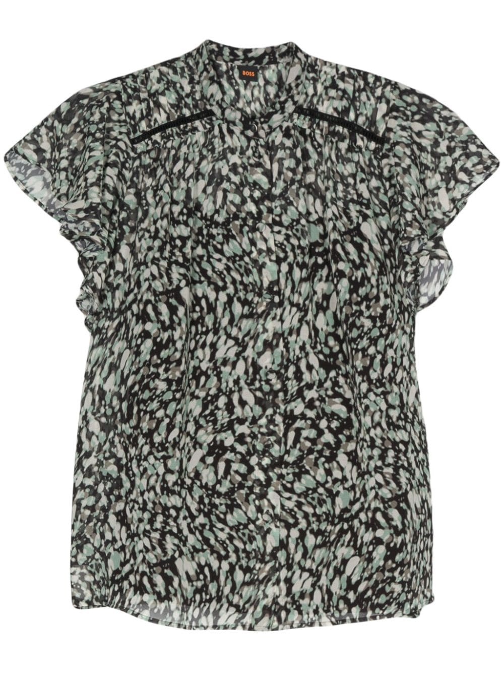graphic-print ruched-detail shirt Highlights - Green/black/white - Recycled polyester - All-over graphic print - Round neck - Short flared sleeves - Ruched detailing - Cut-out detailing - Internal slip top - Front button fastening Imported Composition Outer: Recycled Polyester 100% Lining: Polyester 100%