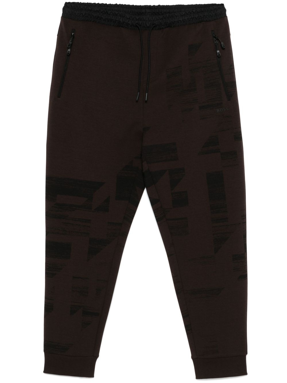 graphic-print track trousers Highlights - Chocolate brown - Elasticated drawstring waistband - Two side zip-fastening pockets - Rear zip-fastening pocket Imported Composition Cotton 80%, Polyester 15%, Elastane 5% Washing instructions Machine Wash