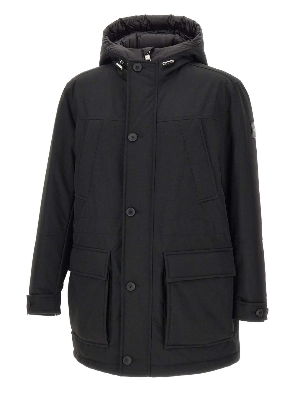 hooded padded jacket Highlights - Black - Front flap pockets - Classic hood - Adjustable cuffs - Front zip and button fastening Imported Composition Outer: Polyamide 100% Filling: Goose Down 80%, Feather 20% Washing instructions Read Manufacturer Guidelines