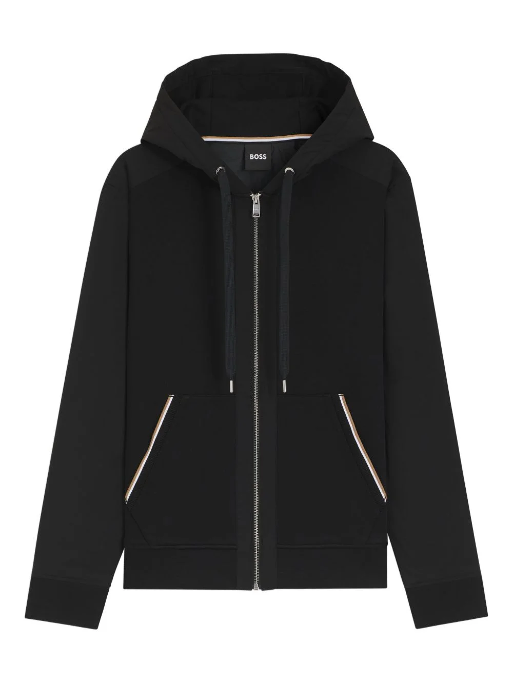 hooded zip-up hoodie Highlights - Black - Cotton - Drawstring-hood - Zip-fastening - Front pouch pockets - Striped-trim Imported Composition Cotton 100% Washing instructions Read Manufacturer Guidelines
