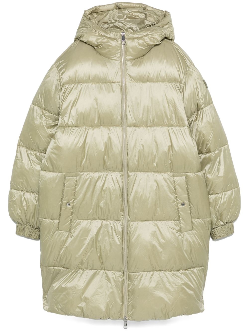 logo-applique coat Highlights - Light olive green - Recycled polyester - Padded design - Front two-way zip fastening - High neck - Classic hood - Applique logo - Elasticated cuffs - Two press-stud fastening side pockets - Internal pocket - Full lining - Straight hem Imported Composition Lining: Polyamide 100%, Recycled Polyester 100% Outer: Recycled Polyamide 100% SIZE & FIT Model measurements Height 5 ft 11 in(1.8 m) Bust/Chest 33.07 in(84 cm) Hips 37.4 in(95 cm) Waist 25.19 in(64 cm) FittingInformation Designed to be unstructured, offering a loose fit throughout Made from a padded non-stretch fabric, giving it no natural elasticity