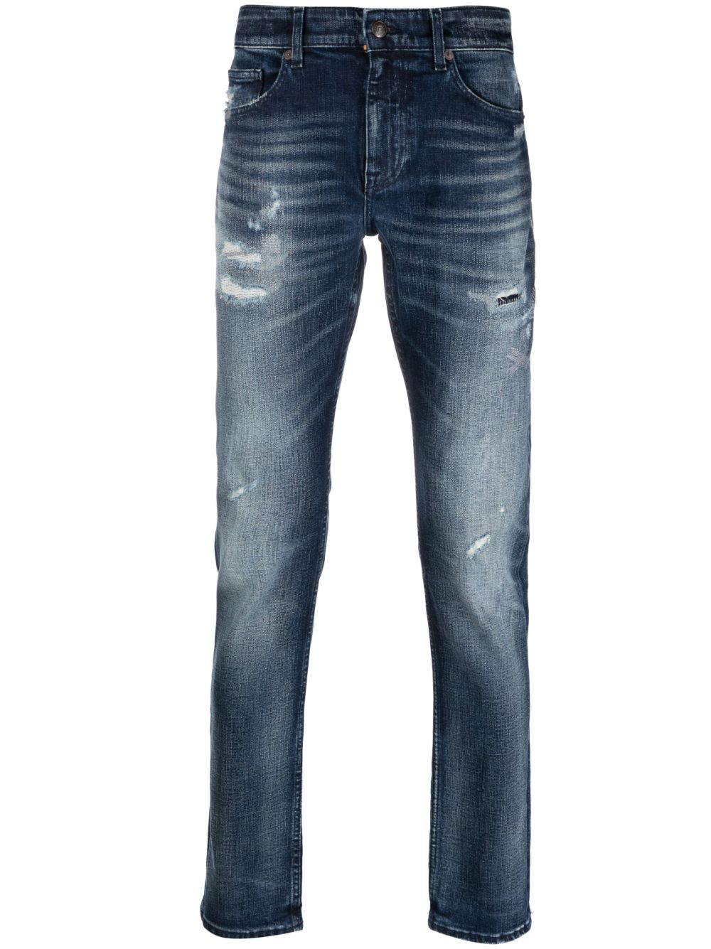 logo-patch distressed jeans Highlights - Dark blue - Stretch-cotton - Denim - Stonewashed - Distressed effect - Logo patch to the rear - Front button and zip fastening - Mid-rise - Slim cut - Classic five pockets Imported Composition Cotton 98%, Elastane 2% SIZE & FIT Model measurements Height 6 ft 2 in(1.88 m) Bust/Chest 36.61 in(93 cm) Hips 35.82 in(91 cm) Waist 27.95 in(71 cm) FittingInformation Designed for a slim fit, these jeans offer a comfortable fit that sits just away from the leg Constructed from stretch denim, this piece offers a stretch fit with durability This piece fits true to size – take your usual size