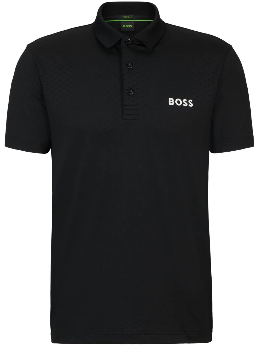 logo-print jacquard polo shirt Highlights - Black - Recycled polyester blend - Technical mesh - Logo print at the chest - Polo collar - Short front button fastening - Short sleeves - Straight hem Imported Composition Recycled Polyester 72%, Polyester 22%, Elastane 6% SIZE & FIT Measurement CHEST 40.94 in(104 cm) SLEEVE LENGTH 8.26 in(21 cm) LENGTH 27.95 in(71 cm) Shoulder Width 17.32 in(44 cm) Washing instructions Machine Wash