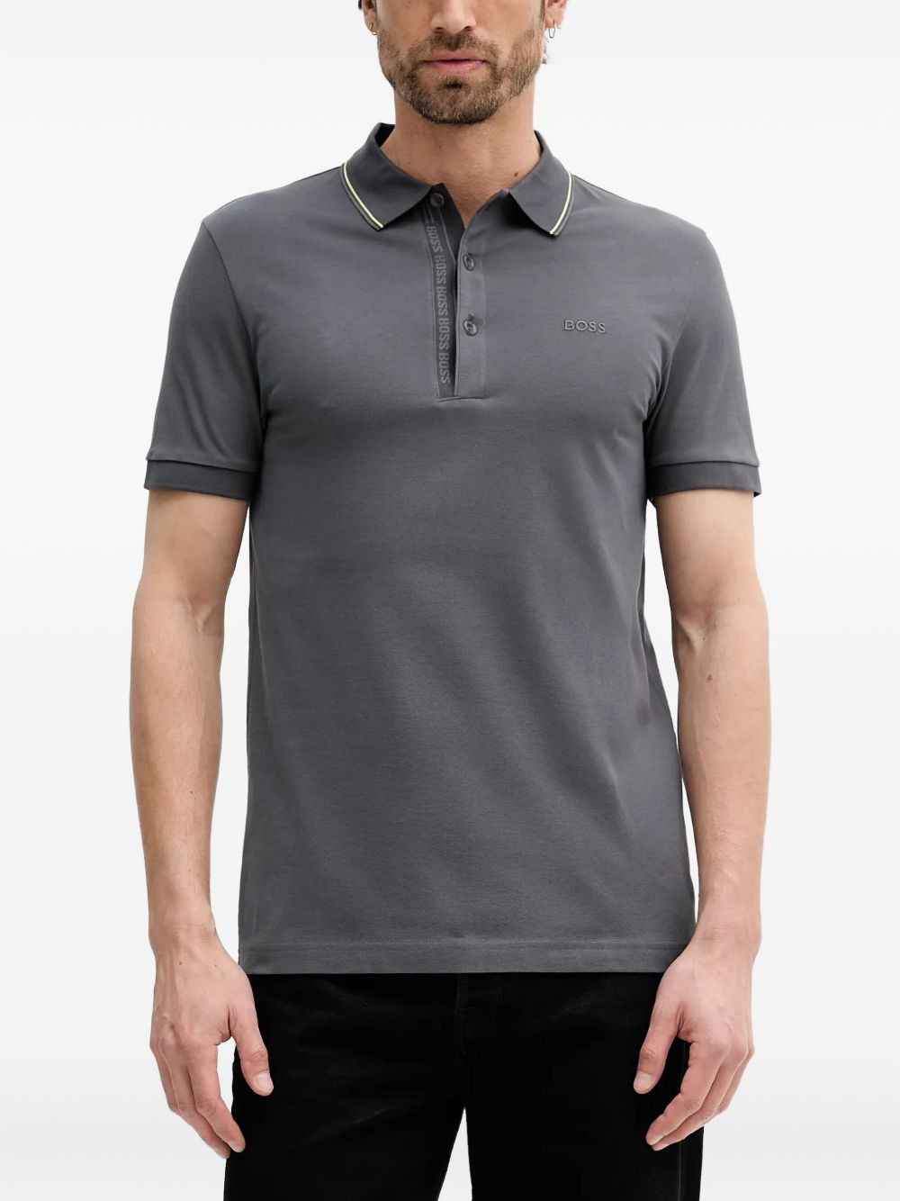 logo-tape polo shirt Highlights - Charcoal grey - Short sleeves - Three-button placket - Lime green trim - Repeated logo tape - Embroidered logo Imported Composition Cotton 100% Washing instructions Read Manufacturer Guidelines