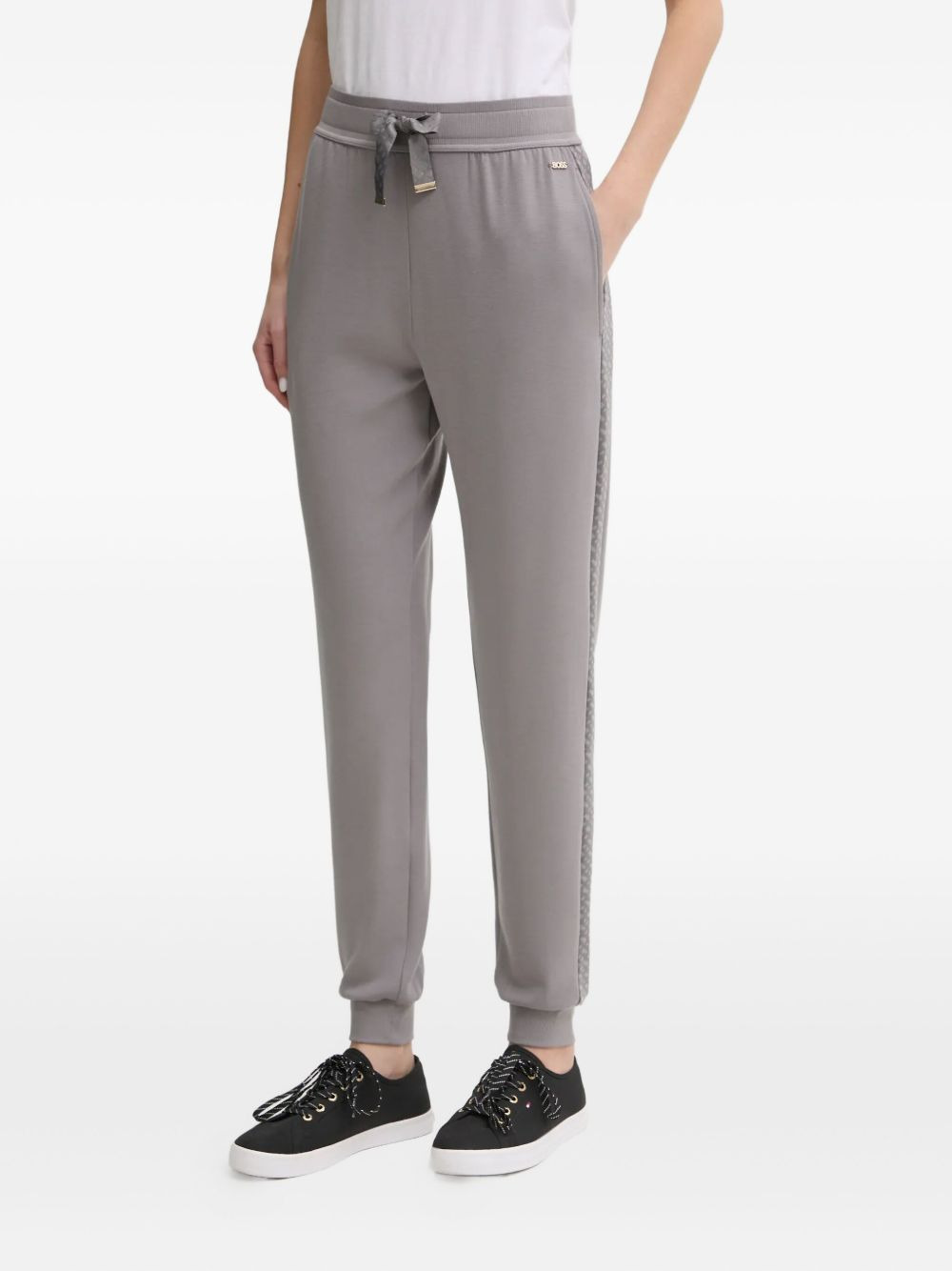 monogram logo-plaque track pants Highlights - Grey - Elasticated waistband - Cuffed hems - Monogram side stripe - Logo plaque Imported Composition Polyacrylic 48%, Modal 42%, Elastane 6%, Silk 4% Washing instructions Machine Wash