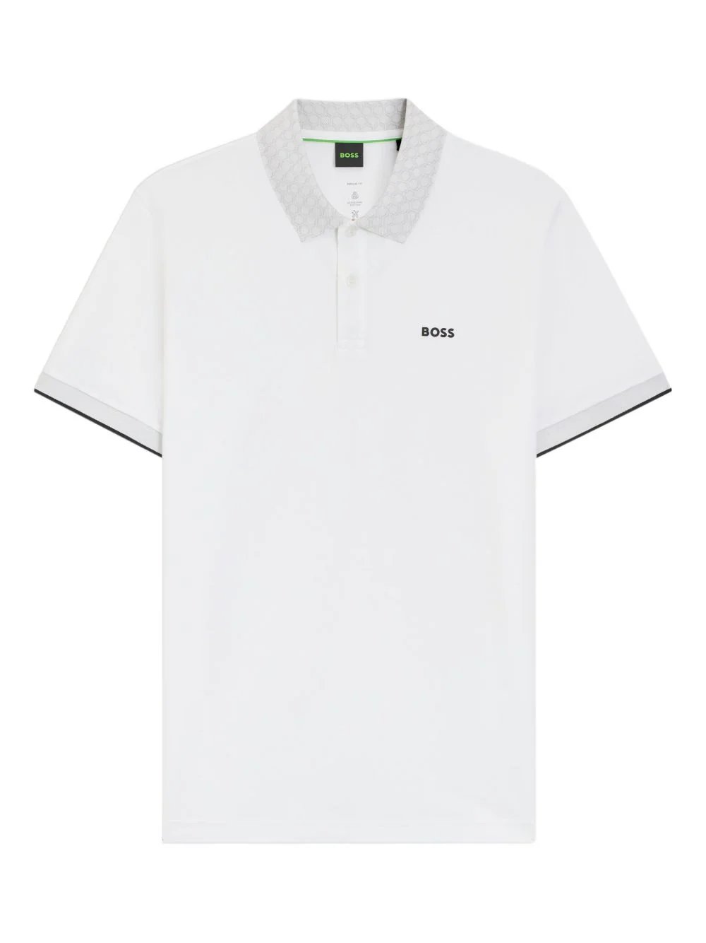 patterned-collar polo shirt Highlights - White - Patterned collar - Logo detail - Short sleeves - Button fastening - Trimmed cuffs Imported Composition Cotton 92%, Elastane 8% Washing instructions Read Manufacturer Guidelines