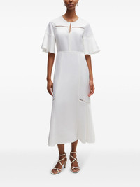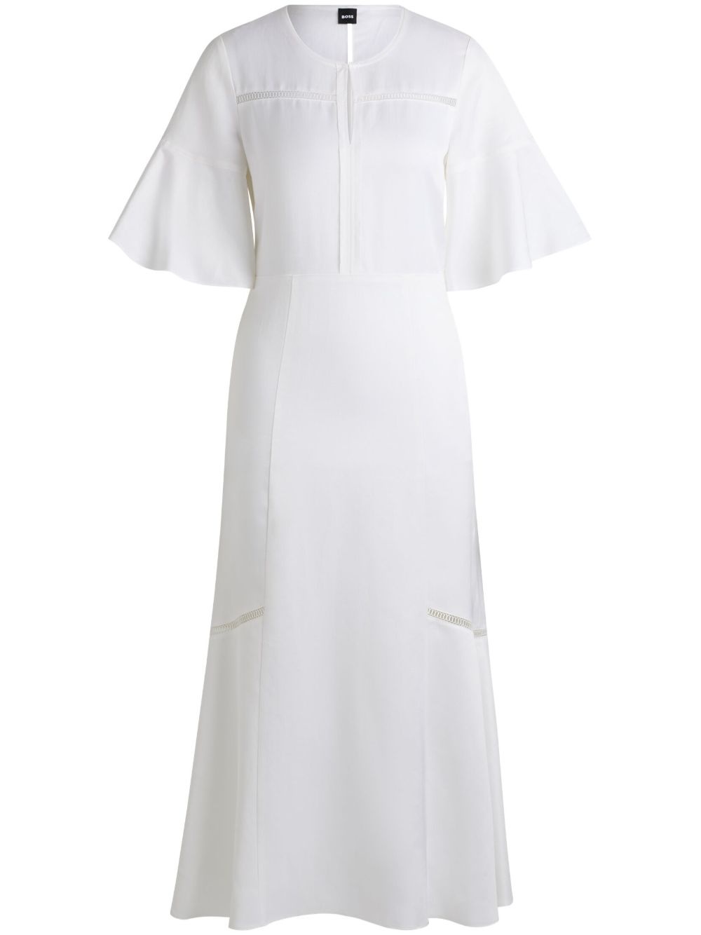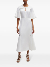 perforated-detailing flared midi dress Highlights - White - Perforated detailing - Round neck - Short sleeves - Fitted waistline - Flared skirt - Straight hem - Mid-length Imported Composition Outer: Viscose 59%, Linen/Flax 41% Lining: Cotton 100%