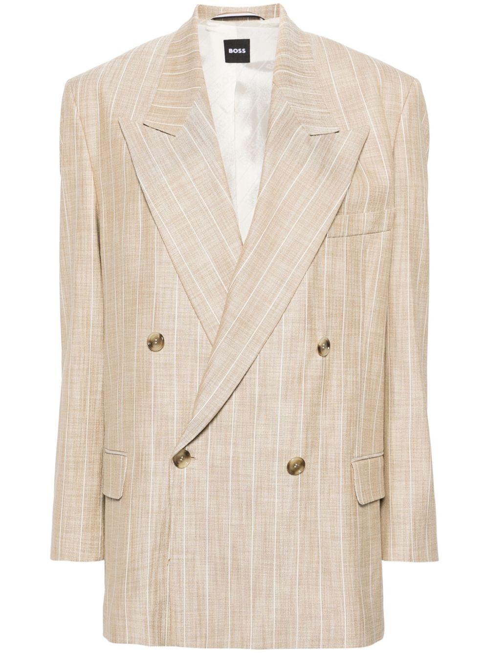 pinstriped double-breasted blazer Highlights - Beige - Pinstripe pattern - Peak lapels - Double-breasted button fastening - Shoulder pads - Long sleeves with buttoned cuffs - Chest welt pocket - Two front flap pockets - Straight hem - Logo-jacquard lining Imported Composition Outer: Viscose 83%, Polyester 14%, Elastane 3% Lining: Viscose 54%, Polyamide 43%, Elastane 3% SIZE & FIT Model measurements Height 5 ft 10 in(1.77 m) Bust/Chest 32.28 in(82 cm) Hips 35.03 in(89 cm) Waist 25.19 in(64 cm) FittingInformation Designed to be unstructured, offering a loose fit throughout The internal shoulder pads offer a structured shape Made from a midweight fabric This piece fits true to size – take your usual size Washing instructions Dry Clean Only