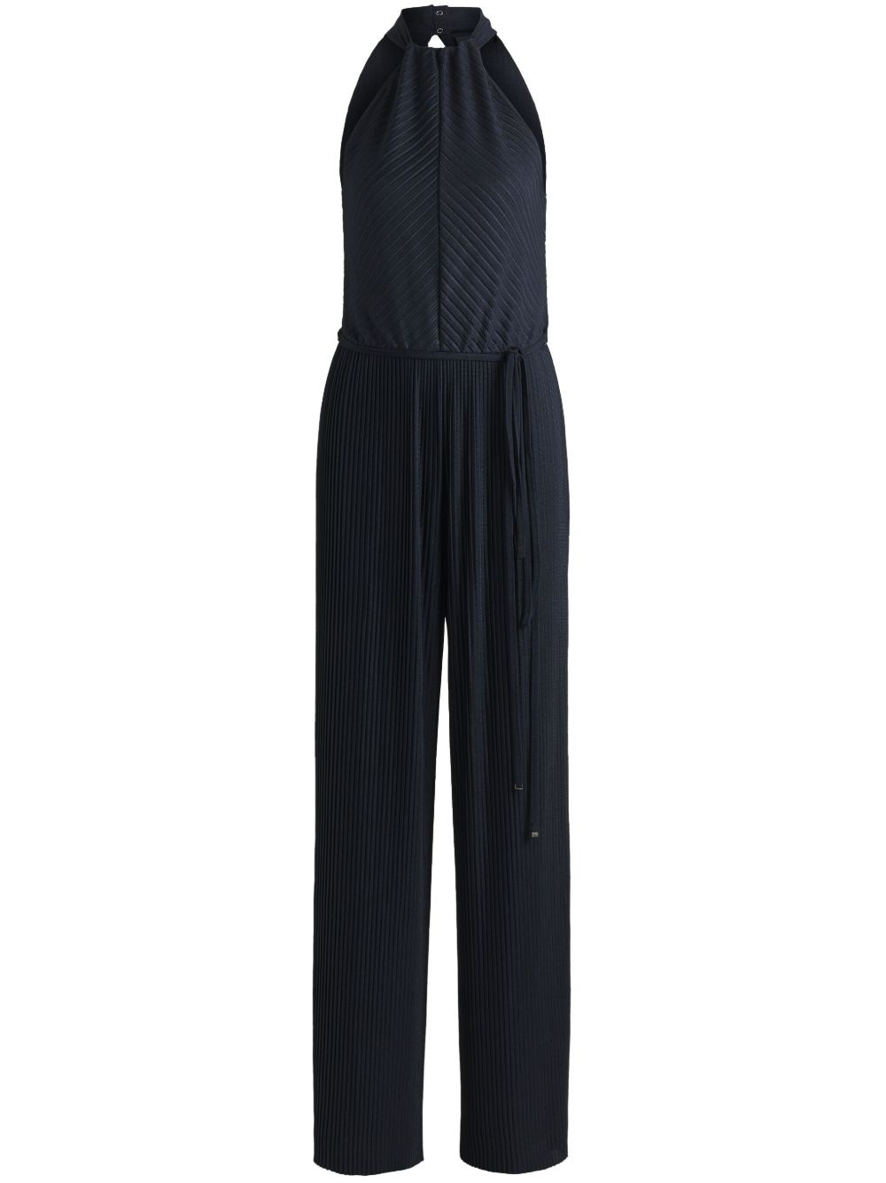 plisse-effect sleeveless jumpsuit Highlights - Black - Rear hook and eye fastening - Stretch-design - Halterneck - Drawstring waist Imported Composition Polyester 95%, Elastane 5% Washing instructions Read Manufacturer Guidelines