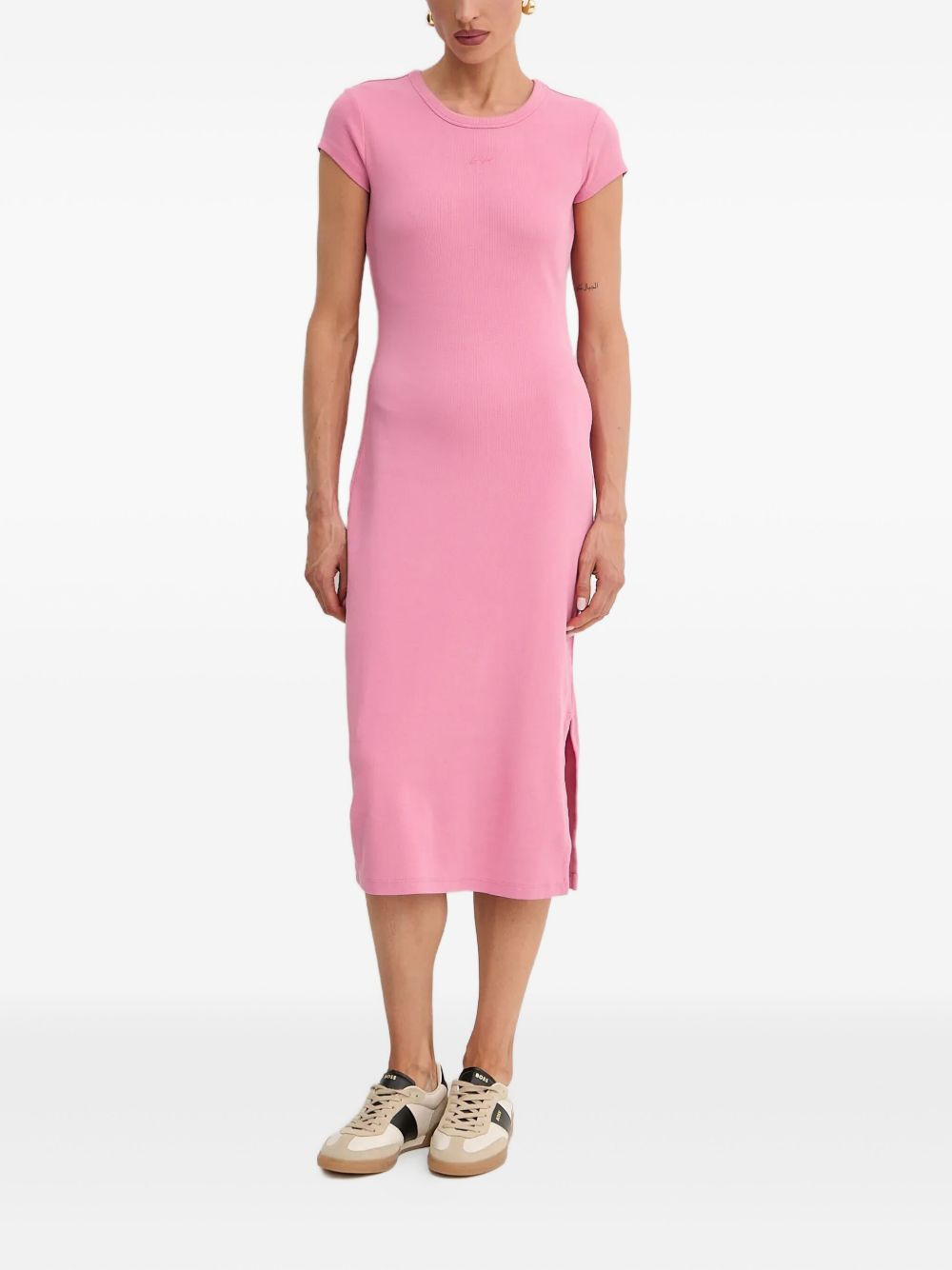 ribbed midi dress Highlights - Pink - Ribbed texture - Short sleeves - Round neck - Side split - Midi length Imported Composition Cotton 96%, Elastane 4% Washing instructions Read Manufacturer Guidelines