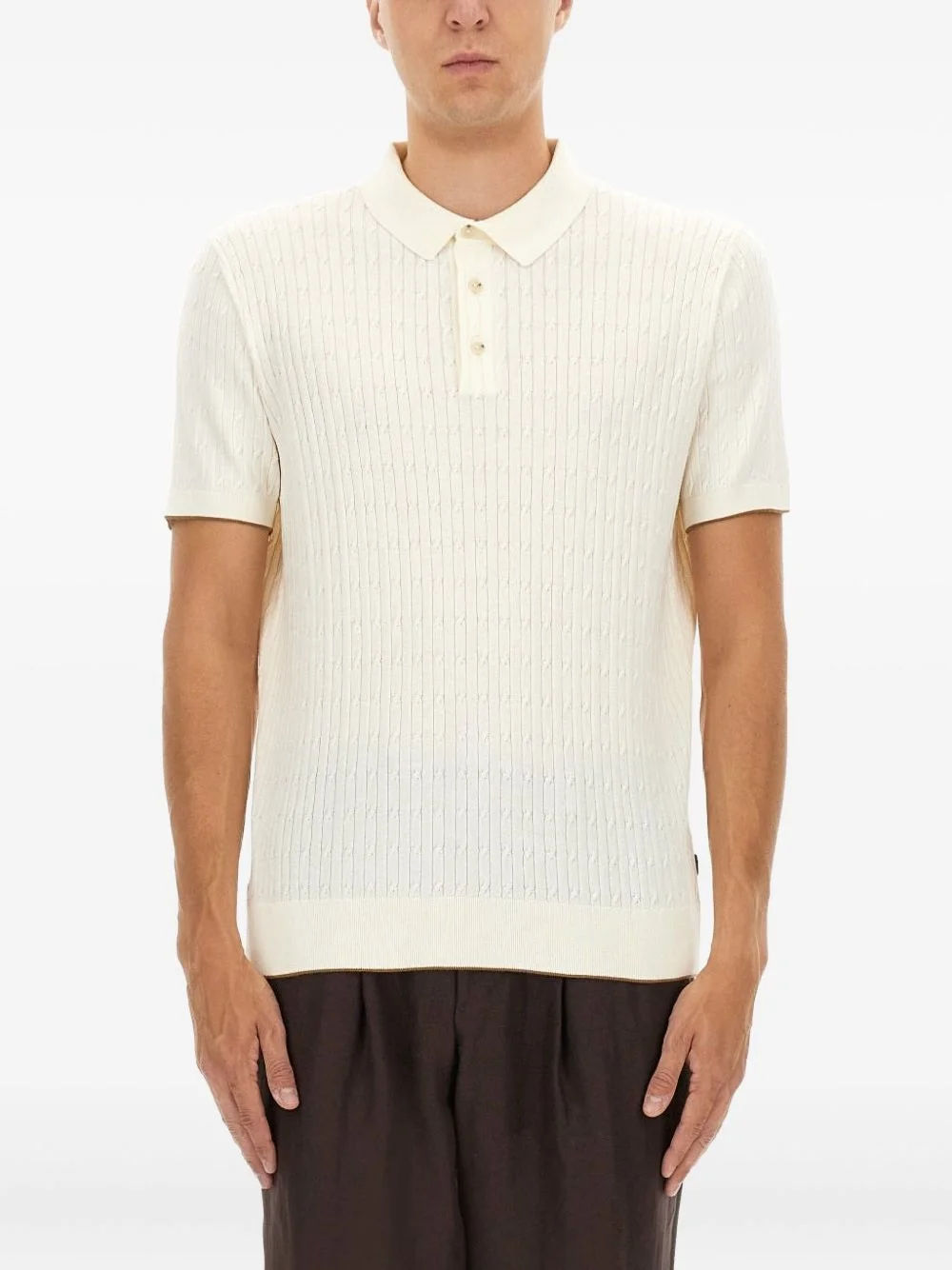 ribbed polo shirt Highlights - Cream - Knitted - Button fastening - Short sleeves - Ribbed hem - Ribbed cuffs Imported Composition Silk 55%, Cotton 45% Washing instructions Read Manufacturer Guidelines
