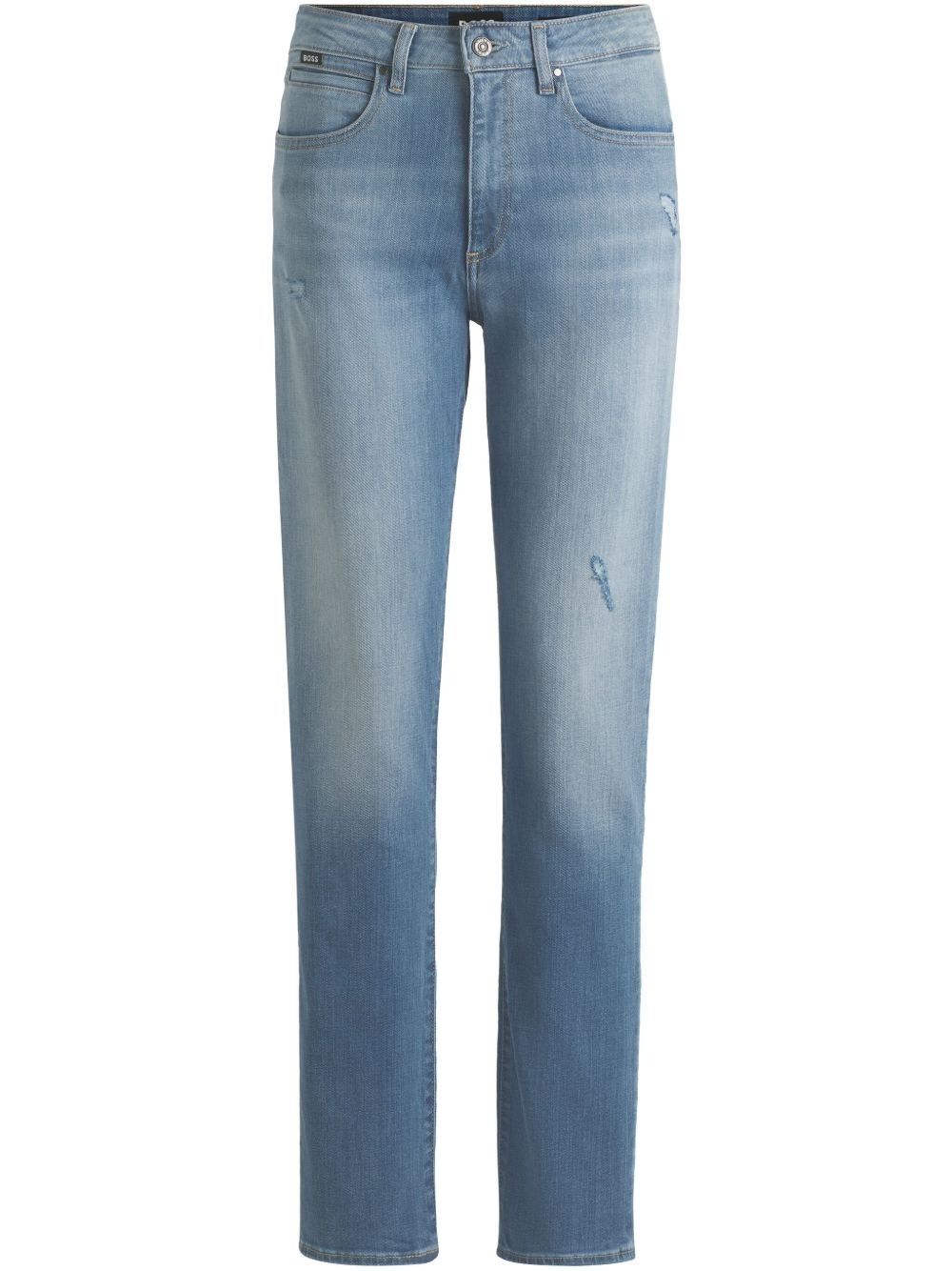 ripped-detail jeans Highlights - Light blue - Front button and zip fastening - Belt loops - Classic five pockets - Logo patch to the rear Imported Composition Cotton 96%, Polyester 4% Washing instructions Read Manufacturer Guidelines