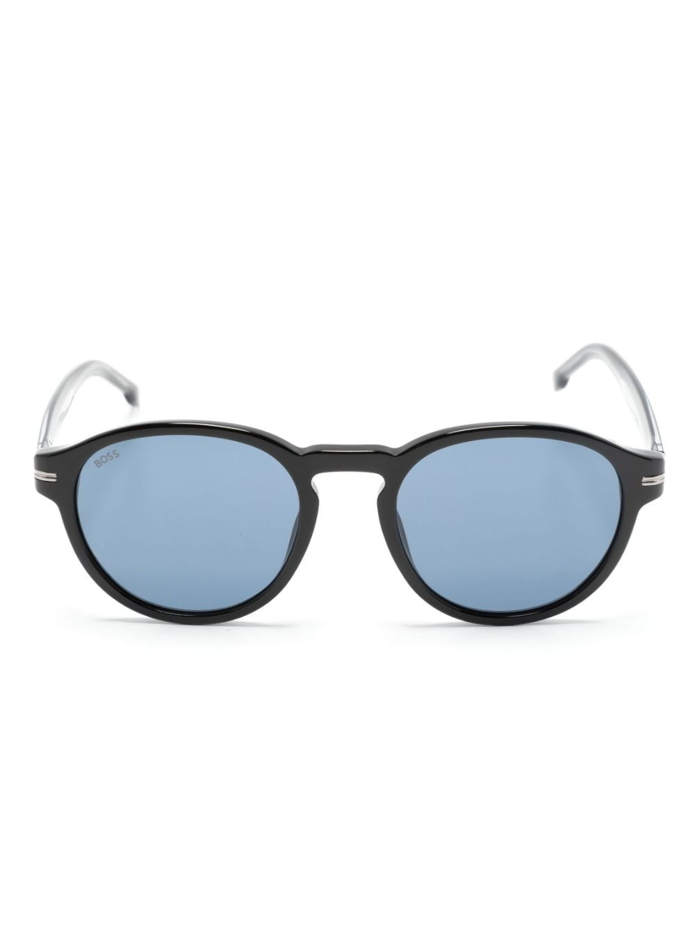 round-frame sunglasses Highlights - Black - Blue tinted lenses - Round frame - Logo print to the front - Straight arms - Curved tips - These glasses come with a protective case. Imported Composition Plastic 100% SIZE & FIT Measurement Arm Length 5.7 in(14.5 cm) Bridge Width 0.78 in(2 cm) Lens Diameter 2.04 in(5.2 cm) Total Width 5.51 in(14 cm)