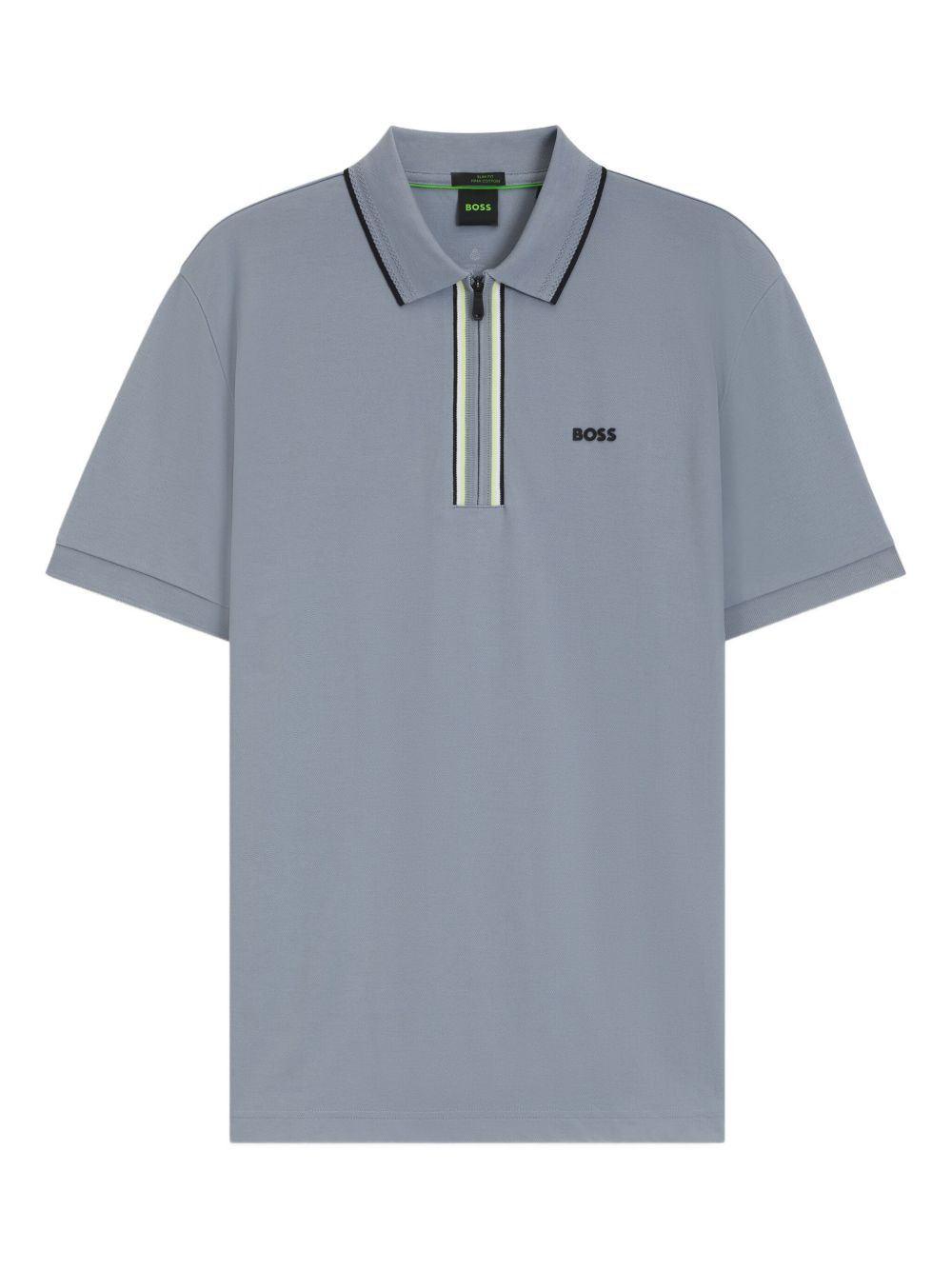 short-zip polo shirt Highlights - Steel blue - Contrasting collar - Zip fastening - Logo detail on chest - Short sleeves Imported Composition Cotton 92%, Elastane 8% SIZE & FIT FittingInformation Designed for a slim fit, this polo shirt offers a comfortable fit that sits just away from the body Made from a midweight stretch fabric, this piece offers elasticity and flexibility when worn Washing instructions Read Manufacturer Guidelines