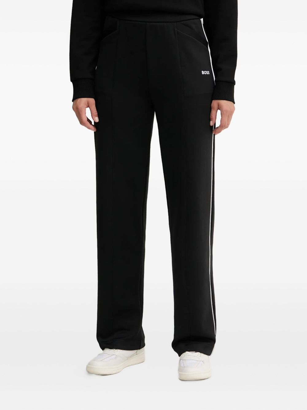 side-stripe trousers Highlights - Black - Side stripe - Straight leg - Elasticated waistband - Embroidered logo Imported Composition Polyester 50%, Cotton 43%, Elastane 7% Washing instructions Read Manufacturer Guidelines