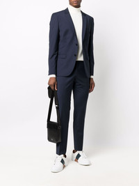 single-breasted suit jacket navy blue wool blend notched lapels front button fastening chest welt pocket two front flap pockets long sleeves two front flap pockets Italian rear vents Imported Composition Outer: Wool 74%, Polyester 22%, Spandex/Elastane 4% Lining: Polyester 25%, Spandex/Elastane 5% SIZE & FIT Model measurements Height 6 ft 2 in(1.89 m) Bust/Chest 35.43 in(90 cm) Hips 36.61 in(93 cm) Waist 28.74 in(73 cm) FittingInformation This piece fits true to size. We recommend you get your regular size Cut for a slim fit Made with a mid-weight stretch fabric Washing instructions Dry Clean Only