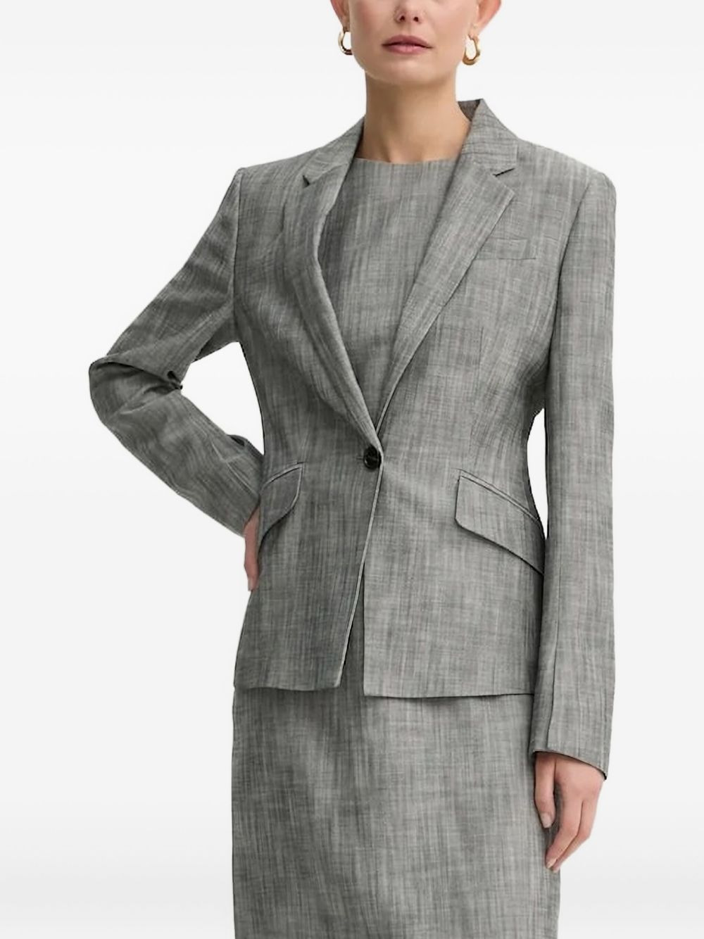 single-button textured top Highlights - Grey - Textured weave - Single button fastening - Notched lapel - Long sleeves - Straight hem Imported Composition Outer: Viscose 91%, Polyester 8%, Elastane 1% Lining: Polyester 100% Washing instructions Read Manufacturer Guidelines