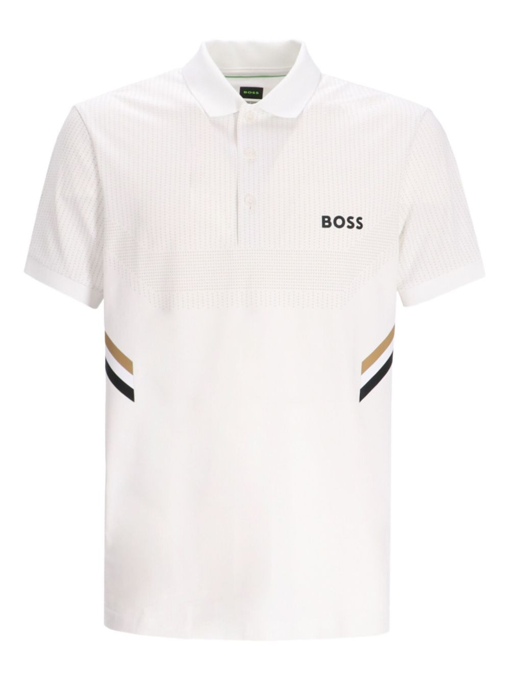 stripe-detail polo shirt Highlights - White - Short sleeves - Textured fabric - Three-stripe detail - Polo collar - Button fastening Imported Composition Polyester 100% Washing instructions Read Manufacturer Guidelines