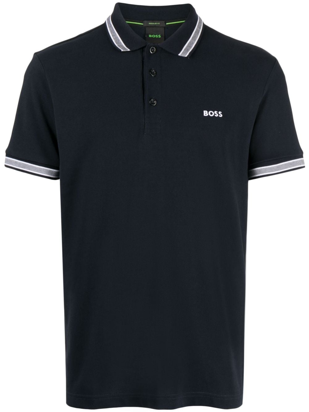 striped-border cotton polo shirt Highlights - Navy blue - Cotton - Striped border - Embroidered logo at the chest - Polo collar - Front button placket - Short sleeves - Straight hem Imported Composition Body: Cotton 100% SIZE & FIT Model measurements Height 6 ft 2 in(1.87 m) Bust/Chest 34.25 in(87 cm) Hips 36.22 in(92 cm) Waist 29.52 in(75 cm) Measurement CHEST 37.79 in(96 cm) LENGTH 26.37 in(67 cm) SLEEVE LENGTH 7.87 in(20 cm) FittingInformation Designed for a regular fit, this polo shirt offers a comfortable loose fit throughout the body Made from a midweight non-stretch fabric, this piece offers minimal elasticity when worn This piece fits true to size – take your usual size Washing instructions Machine Wash