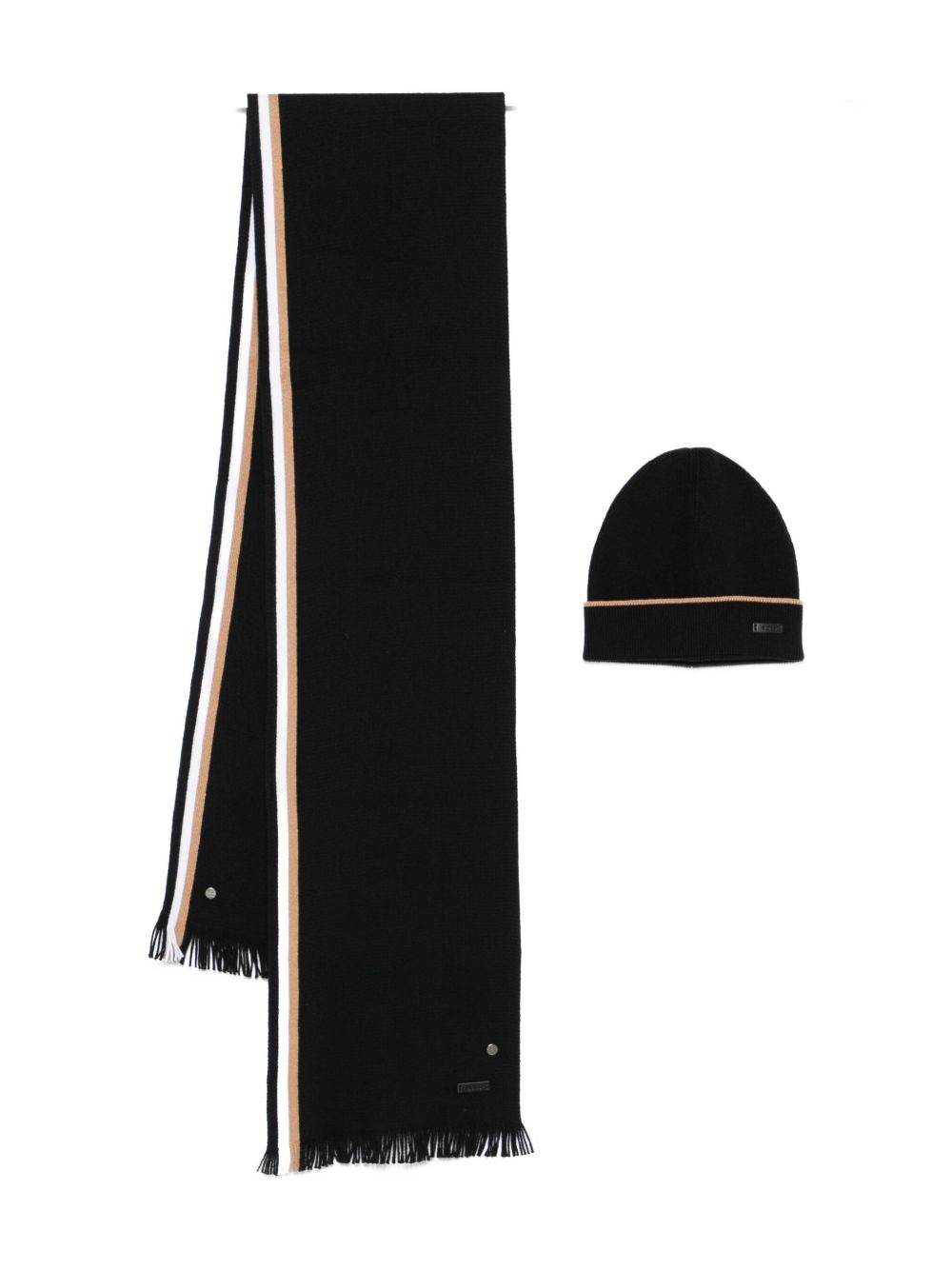 striped fringed scarf beanie set Highlights - Black - Striped - Fringed edge - Logo patch - Set of two Imported Composition Modacrylic 51%, Cotton 47%, Polyester 2% Washing instructions Read Manufacturer Guidelines