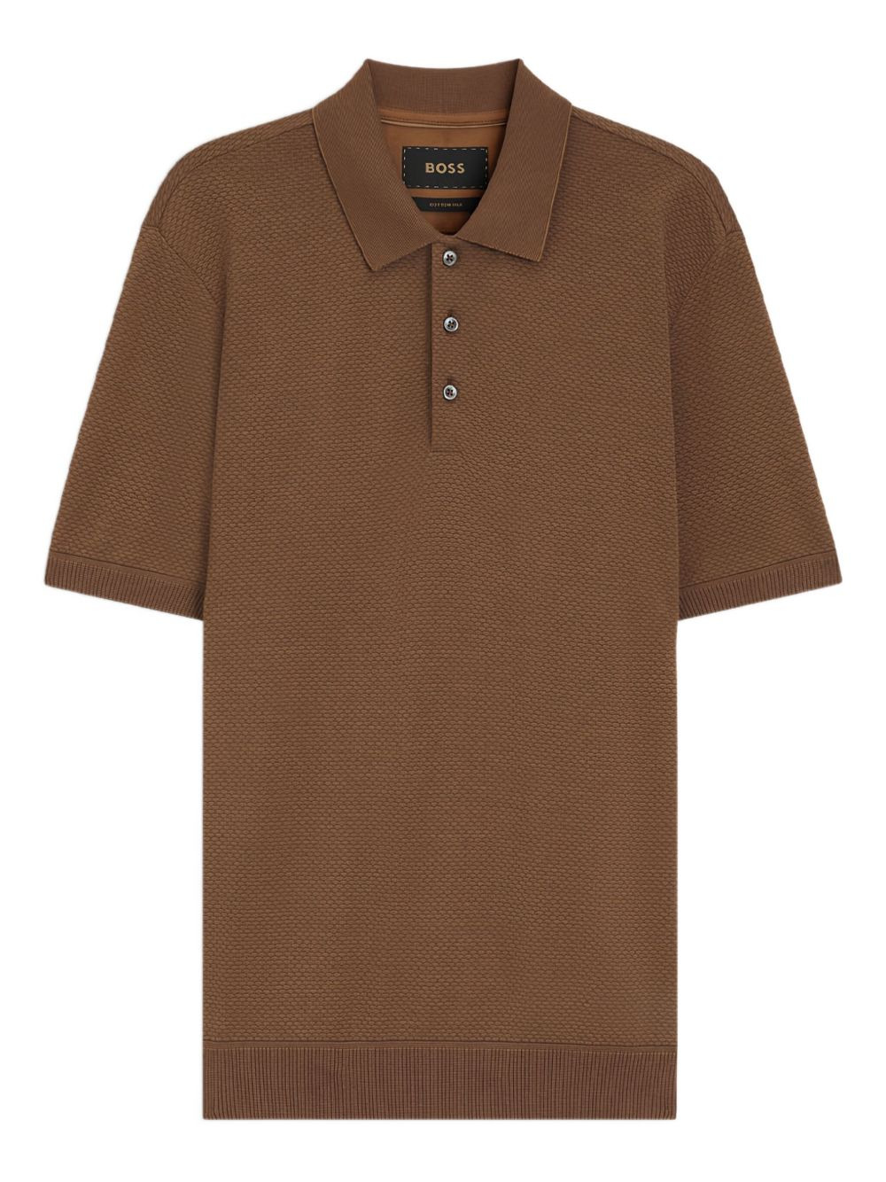 textured polo shirt Highlights - Brown - Short sleeves - Cotton-silk blend - Polo collar - Button placket Imported Composition Cotton 75%, Silk 25% Washing instructions Read Manufacturer Guidelines