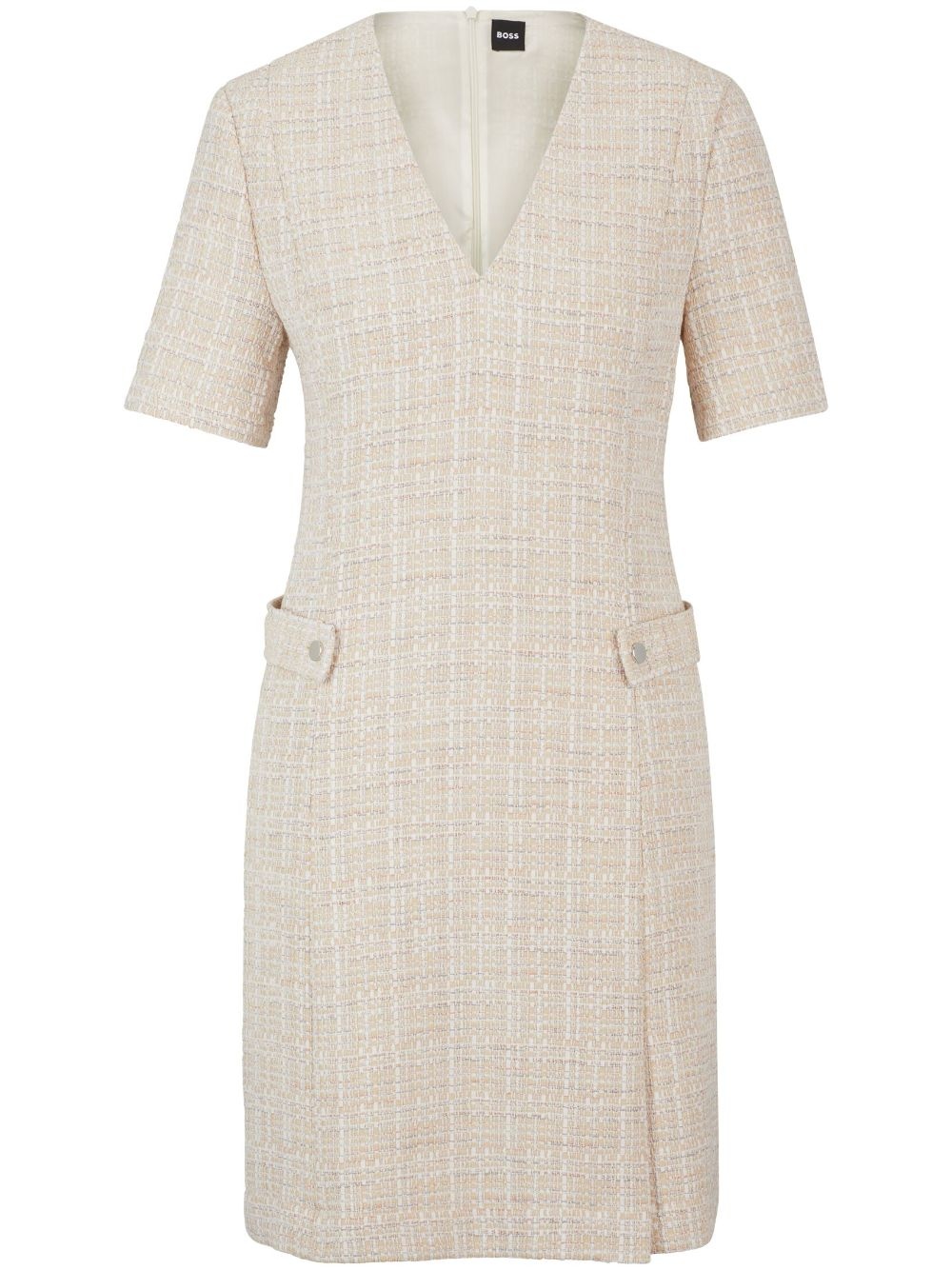 tweed mini dress Highlights - Light beige - Tweed - V-neck - Concealed rear zip fastening - Short sleeves - Side slit - Thigh-length - Straight hem Imported Composition Outer: Polyester 51%, Cotton 39%, Polyacrylic 10% Lining: Viscose 64%, Polyester 36%