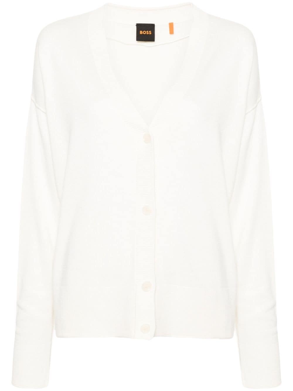 V-neck ribbed-knit cardigan Highlights - White - Knitted construction - Vertical seamed - Applique logo - Ribbed v-neck - Front button fastening - Drop shoulder - Long sleeves - Ribbed cuffs and hem - Straight hem Imported Composition Viscose 40%, Polyamide 35%, Modal 25% SIZE & FIT Model measurements Height 5 ft 10 in(1.78 m) Bust/Chest 29.92 in(76 cm) Hips 34.64 in(88 cm) Waist 23.62 in(60 cm) FittingInformation Designed for a relaxed fit, this piece allows for comfort and movement when worn Made with a midweight knit, this piece offers some stretch This piece fits true to size – take your usual size