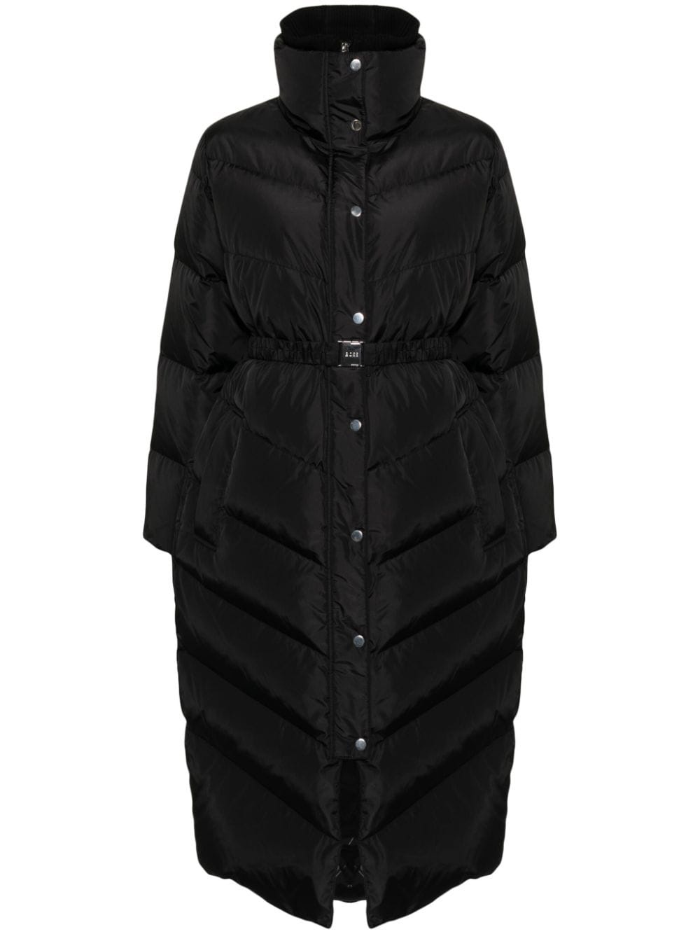 water-repellent padded coat Highlights - Black - Recycled polyester - Water-repellent - Down-feather filling - Padded design - High neck with layered collar - Long sleeves - Elasticated cuffs - Belted waist - Two side slit pockets - Internal patch pocket - Internal logo patch - Full lining - Front press-stud and two-way zip fastening Imported Composition Outer: Recycled Polyester 100%, Polyacrylic 50%, Wool 50% Lining: Feather Down 100%, Polyamide 100% Washing instructions Dry Clean Only