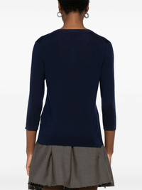 wool sweater Highlights - Navy blue - Virgin wool - Fine knit - Short front button fastening - Crew neck - Three-quarter length sleeves - Ribbed trim Imported Composition Virgin Wool 100%, Recycled Viscose 87%, Polyamide 12%, Elastane 1% SIZE & FIT Model measurements Height 5 ft 11 in(1.8 m) Bust/Chest 31.49 in(80 cm) Hips 36.61 in(93 cm) Waist 24.4 in(62 cm) FittingInformation Designed for a relaxed fit, this piece allows for comfort and movement when worn Made with a midweight knit, this piece offers some stretch Washing instructions Hand Wash