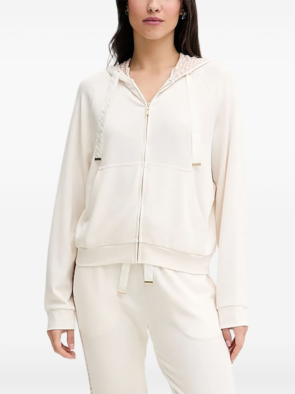 zip-up hoodie Highlights - Off-white - Patterned hood - Zip fastening - Long sleeves - Ribbed hem Imported Composition Polyacrylic 48%, Modal 42%, Elastane 6%, Silk 4% Washing instructions Read Manufacturer Guidelines