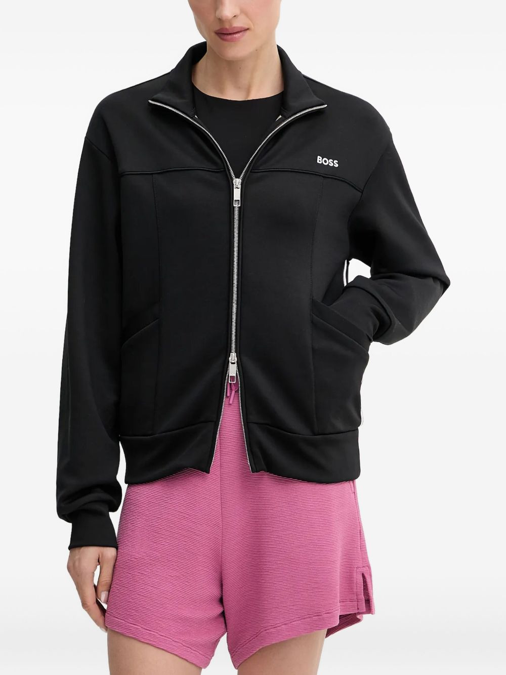 zipped sweatshirt Highlights - Black - Zip fastening - High neck - Panelled design - Long sleeves - Embroidered logo Imported Composition Polyester 50%, Cotton 43%, Elastane 7% Washing instructions Read Manufacturer Guidelines