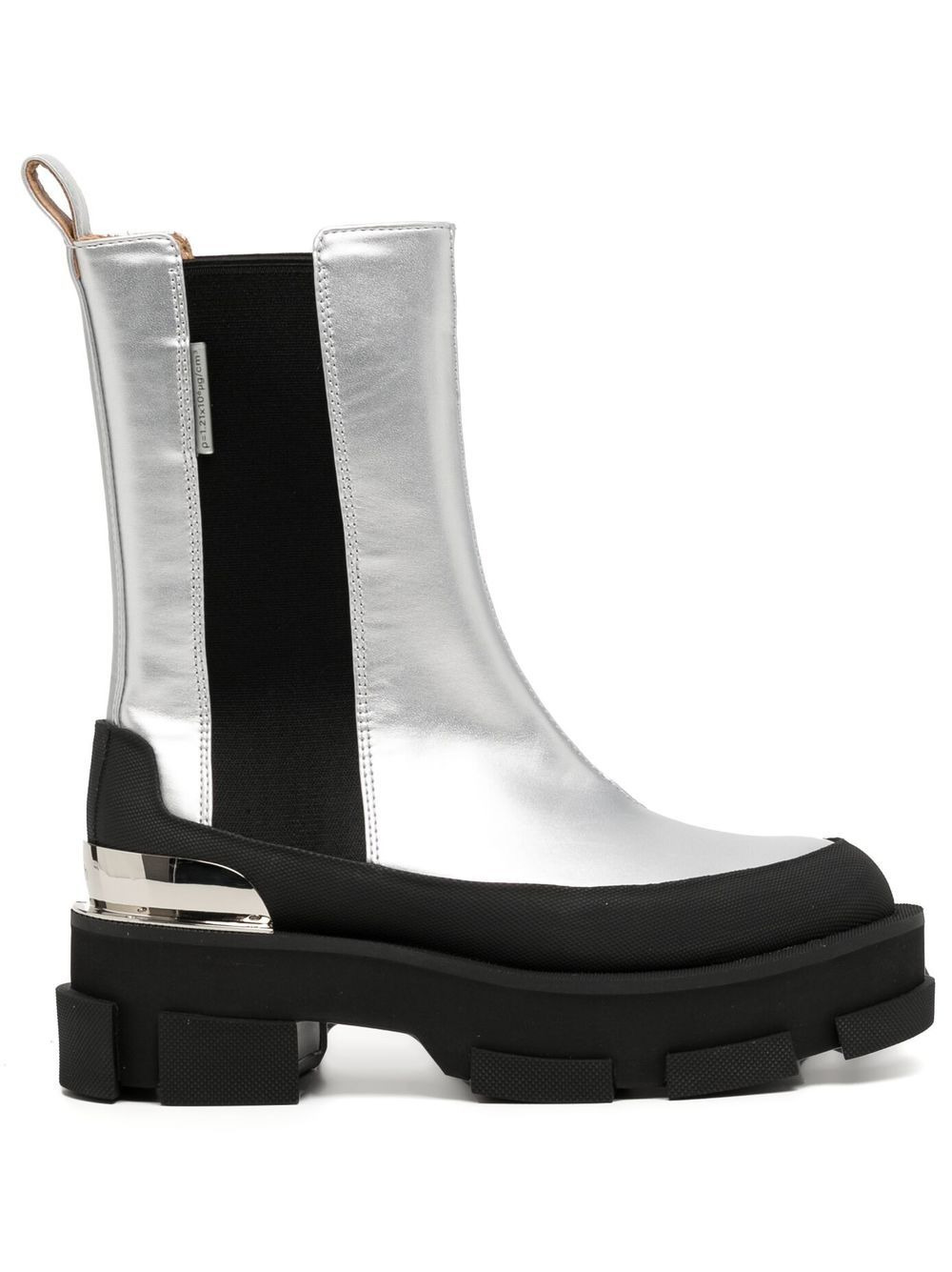 metallic leather ankle boots silver/black leather metallic finish elasticated side panel silver-tone hardware to the heel counter pull tab to the rear round toes contrasting mid sole contrasting chunky rubber sole Imported Composition Body: Calf Leather 100% Lining: Leather 100% Sole: Rubber 100% SIZE & FIT Measurement CIRCUMFERENCE 11.02 in(28 cm) HEIGHT 8.26 in(21 cm) Sole height 2.36 in(6 cm) Washing instructions Do Not Wash/Do Not Dry Clean