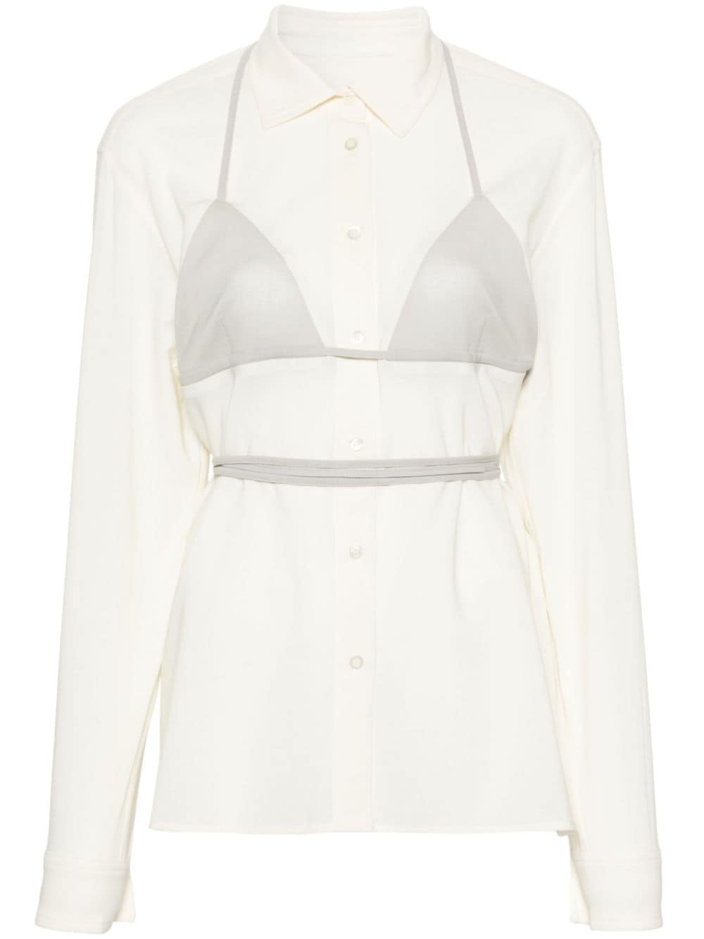 panelled-design cotton shirt Highlights - Light beige/light grey - Cotton - Panelled design - Classic collar - Long sleeves - Buttoned-cuff sleeves - Straight hem - Self-tie fastening - Front button fastening Imported Composition Cotton 100%, Viscose 57%, Virgin Wool 39%, Spandex/Elastane 4%