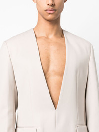plunging V-neck wool blazer Highlights - Almond beige - Wool - Plunging v-neck - Collarless - Long sleeves - Two front flap pockets - Buttoned cuffs - Straight hem - When buying this unisex item, keep in mind that it is graded in standard men's sizing. Made in Italy Composition Lining: Viscose 100% SIZE & FIT Model measurements Height 6 ft 2 in(1.87 m) Bust/Chest 38.18 in(97 cm) Hips 36.61 in(93 cm) Waist 29.13 in(74 cm) FittingInformation This piece is unisex – expect a slim fit if you usually select men's sizing; expect a looser fit if you usually select women's sizes The vented hem offers movement at the rear Made from a midweight non-stretch fabric