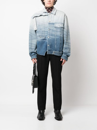 whiskering-effect denim jacket Highlights - Light blue - Organic cotton - Denim - Mid wash - Whiskering effect - Logo patch to the rear - Classic collar - Front button fastening - Long sleeves - Buttoned cuffs - Two front flap pockets - Asymmetric hem Imported Composition Organic Cotton 100% SIZE & FIT Model measurements Height 6 ft 1 in(1.86 m) Bust/Chest 34.64 in(88 cm) Hips 35.43 in(90 cm) Waist 27.55 in(70 cm) FittingInformation Designed to be unstructured, offering a loose fit throughout Sturdy and hard-wearing, this denim piece offers no stretch This piece fits true to size – take your usual size Washing instructions Machine Wash