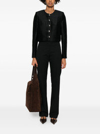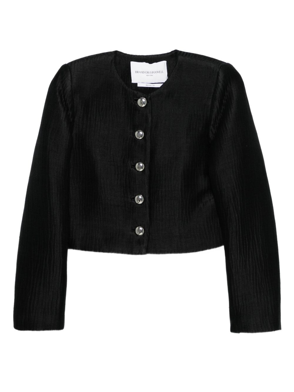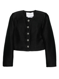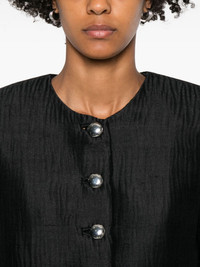 single-breasted button-front jacket Highlights - Black - Ribbed texture - Crew neck - Long sleeves - Single-breasted closure - Metallic buttons Made in United States Composition Lining: Silk 93%, Spandex/Elastane 7% Outer: Silk 100% SIZE & FIT Model measurements Height 5 ft 10 in(1.77 m) Bust/Chest 33.07 in(84 cm) Hips 37 in(94 cm) Waist 24.8 in(63 cm) Washing instructions Dry Clean Only