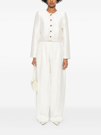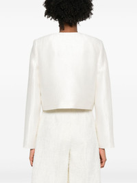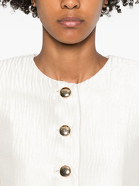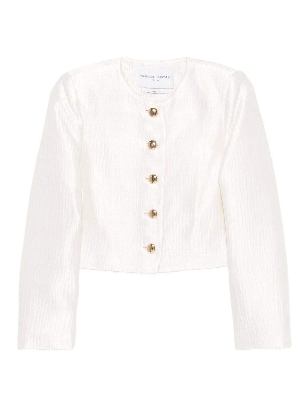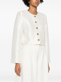 single-breasted silk jacket Highlights - Pearl - Textured silk - Crew neck - Single breasted - Gold buttons - Long sleeves Made in United States Composition Outer: Silk 100% Lining: Silk 93%, Spandex/Elastane 7% SIZE & FIT Model measurements Height 5 ft 10 in(1.77 m) Bust/Chest 33.07 in(84 cm) Hips 37 in(94 cm) Waist 24.8 in(63 cm) Washing instructions Dry Clean Only