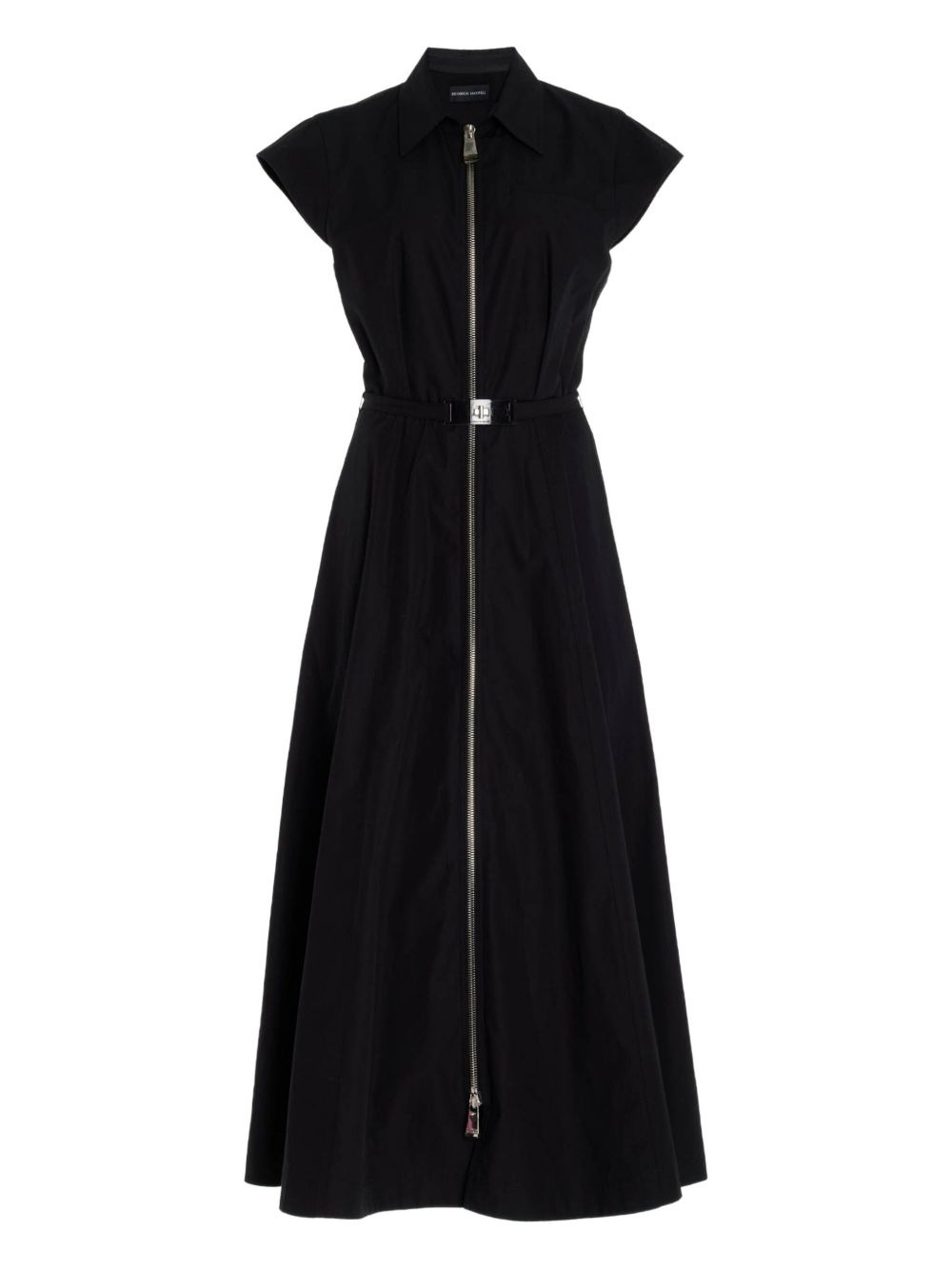 zip-up belted dress Highlights - Black - Front zip fastening - Belted waist - Short sleeves - A-line Made in United States Composition Cotton 100% Washing instructions Read Manufacturer Guidelines