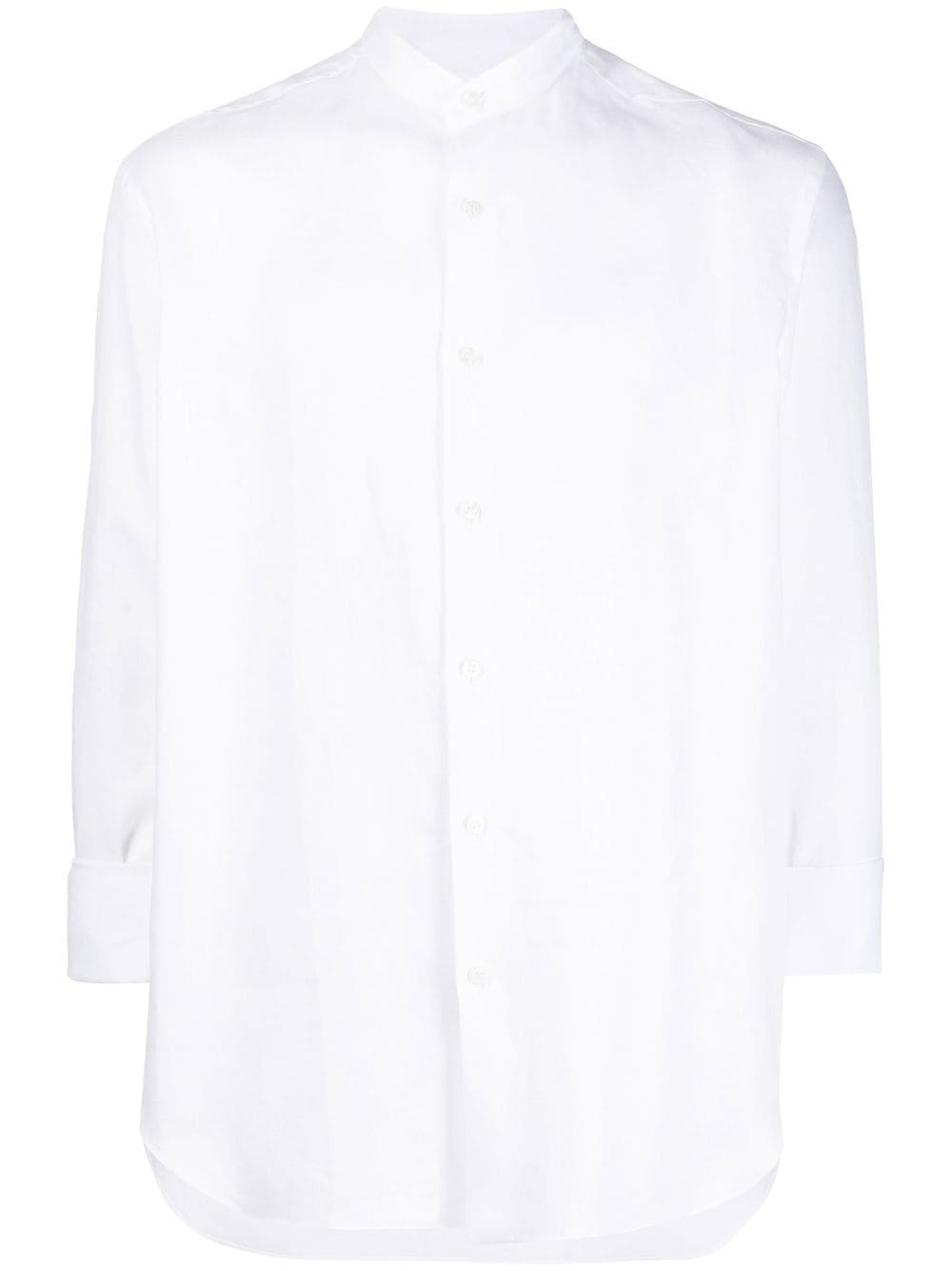 band collar linen shirt Brioni's refined tailoring is evident in this band-collar shirt. Crafted from linen in a crisp white hue, it's complete with front button fastenings and a curved hem. Highlights - White - Linen/flax - Band collar - Front button fastening - Long sleeves - Buttoned cuffs - Curved hem Made in Italy Composition Linen/Flax 100% SIZE & FIT Model measurements Height 6 ft 1 in(1.86 m) Bust/Chest 37.4 in(95 cm) Hips 34.64 in(88 cm) Waist 29.13 in(74 cm) FittingInformation This piece fits true to size. We recommend you get your regular size Cut for a loose fit Made with a mid-weight non-stretch fabric Washing instructions Machine Wash