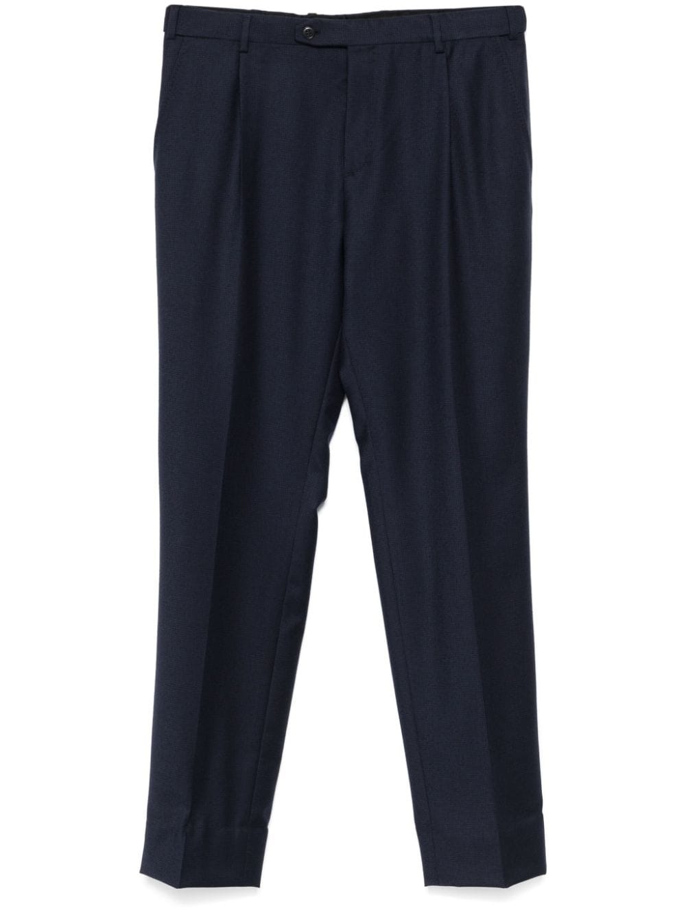 Journey trousers Highlights - Navy blue/black - Wool blend - Flannel - Brushed finish - Puppytooth pattern - Concealed front button, hook and zip fastening - Off-centre front fastening - Belt loops - Pleat detailing - Two diagonal pockets to the sides - Pressed crease - Rear dart detailing - Two rear button-fastening jetted pockets - Tapered leg Made in Italy Composition Outer: Wool 95%, Cashmere 5% Lining: Cupro 100%, Modal 50%, Cotton 50% Washing instructions Dry Clean Only