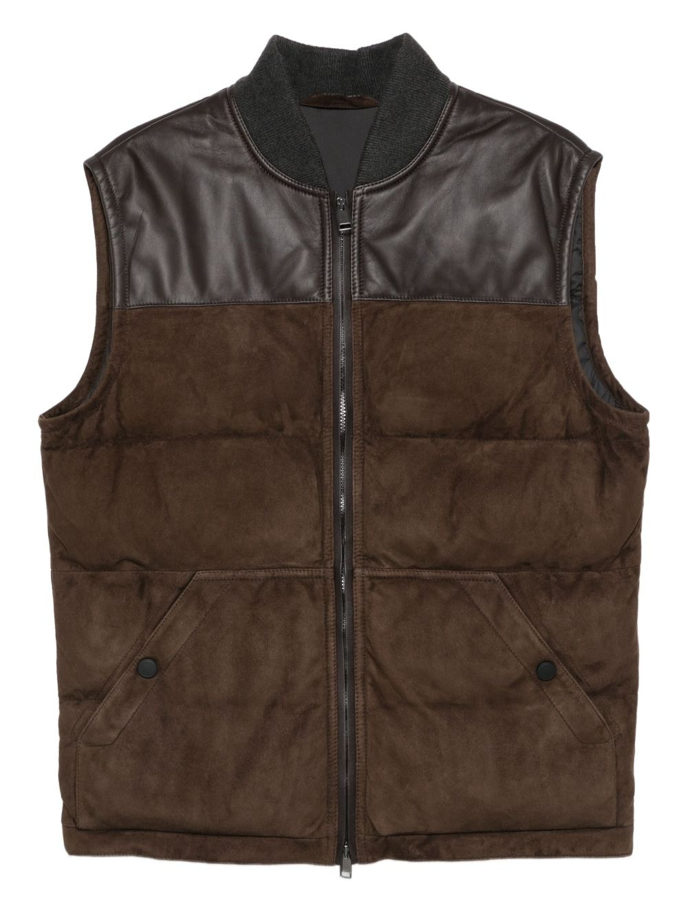 leather-panel quilted vest Highlights - Brown - Leather yoke - Quilted design - Zip front fastening - Welt pockets - Buttoned flap pockets Made in Italy Composition Outer: Lambskin 100%, Wool 48%, Acrylic 47%, Polyamide 3%, Elastane 2% Lining: Polyester 100% SIZE & FIT Model measurements Height 6 ft 1 in(1.85 m) Bust/Chest 35.82 in(91 cm) Hips 37.79 in(96 cm) Waist 29.13 in(74 cm) Washing instructions Dry Clean Only