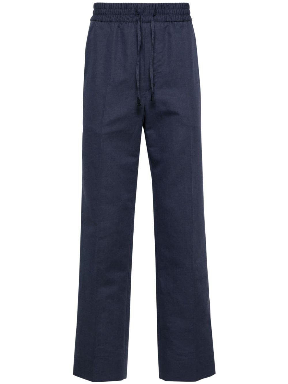 mid-rise straight-leg trousers Highlights - Blue - Linen-cotton blend - Interlock twill weave - Pressed crease - Mid-rise - Elasticated drawstring waistband - Concealed front zip fastening - Two side slit pockets - Two rear jetted pockets - Tailored cut - Tapered leg Made in Italy Composition Outer: Goat Skin 100%, Linen/Flax 53%, Cotton 47% Lining: Cotton 50%, Modal 50% SIZE & FIT Model measurements Height 6 ft 2 in(1.87 m) Bust/Chest 36.41 in(92.5 cm) Hips 37 in(94 cm) Waist 29.52 in(75 cm) FittingInformation Designed for a tapered leg, offering a loose unrestricted fit over the leg with a closer fit towards the ankle Adjust this piece’s waistband to your preference using the drawstring Made from a midweight non-stretch fabric This piece fits true to size – take your usual size