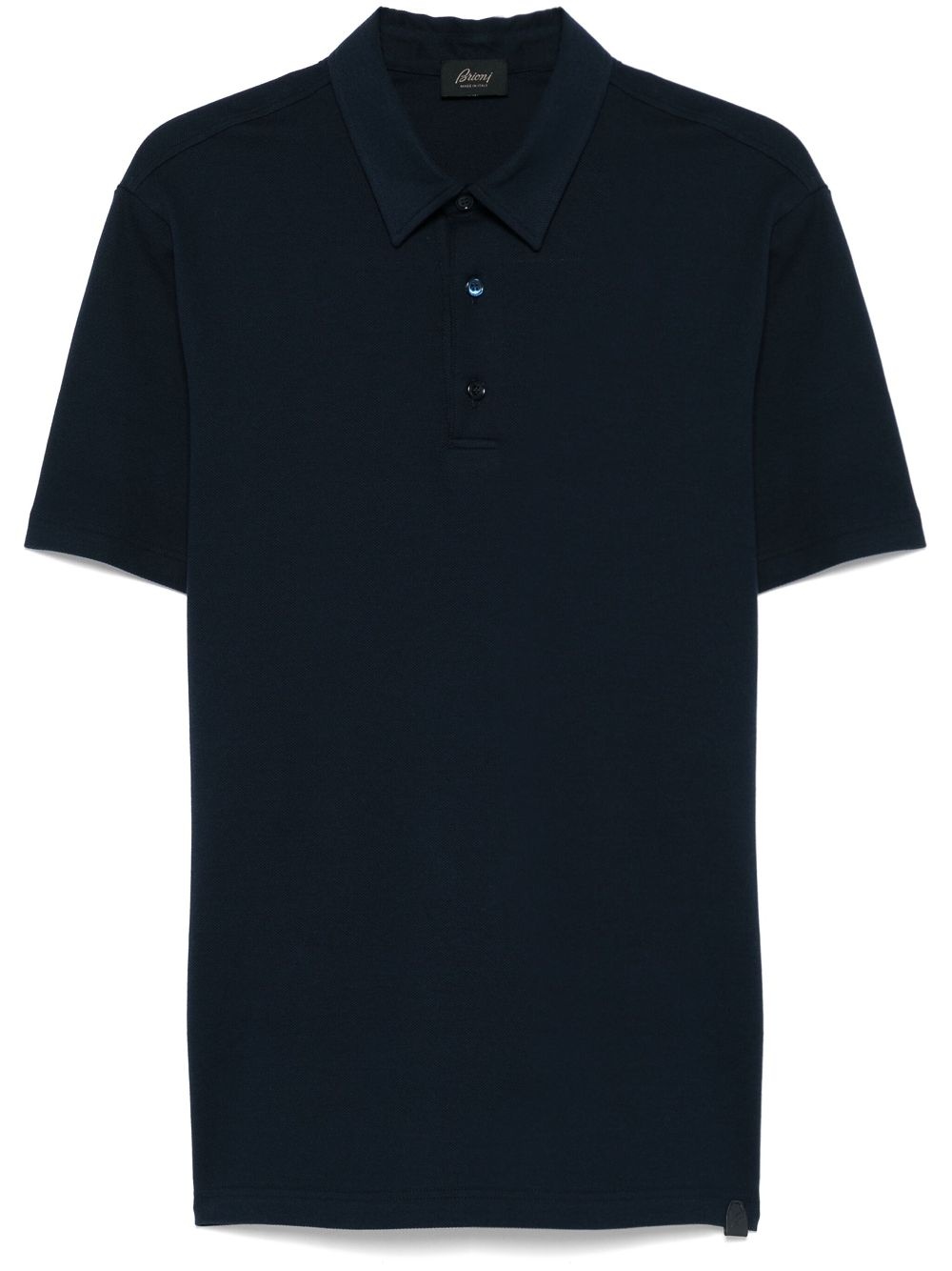 pique cotton polo shirt Highlights - Navy blue - Short front button fastening - Short side slits - Short sleeves Made in Italy Composition Cotton 100%, Lambskin 100% SIZE & FIT Model measurements Height 6 ft 2 in(1.87 m) Bust/Chest 37.79 in(96 cm) Hips 37.79 in(96 cm) Waist 30.31 in(77 cm) FittingInformation Designed for a regular fit, this polo shirt offers a comfortable loose fit throughout the body Made from a midweight non-stretch fabric, this piece offers minimal elasticity when worn