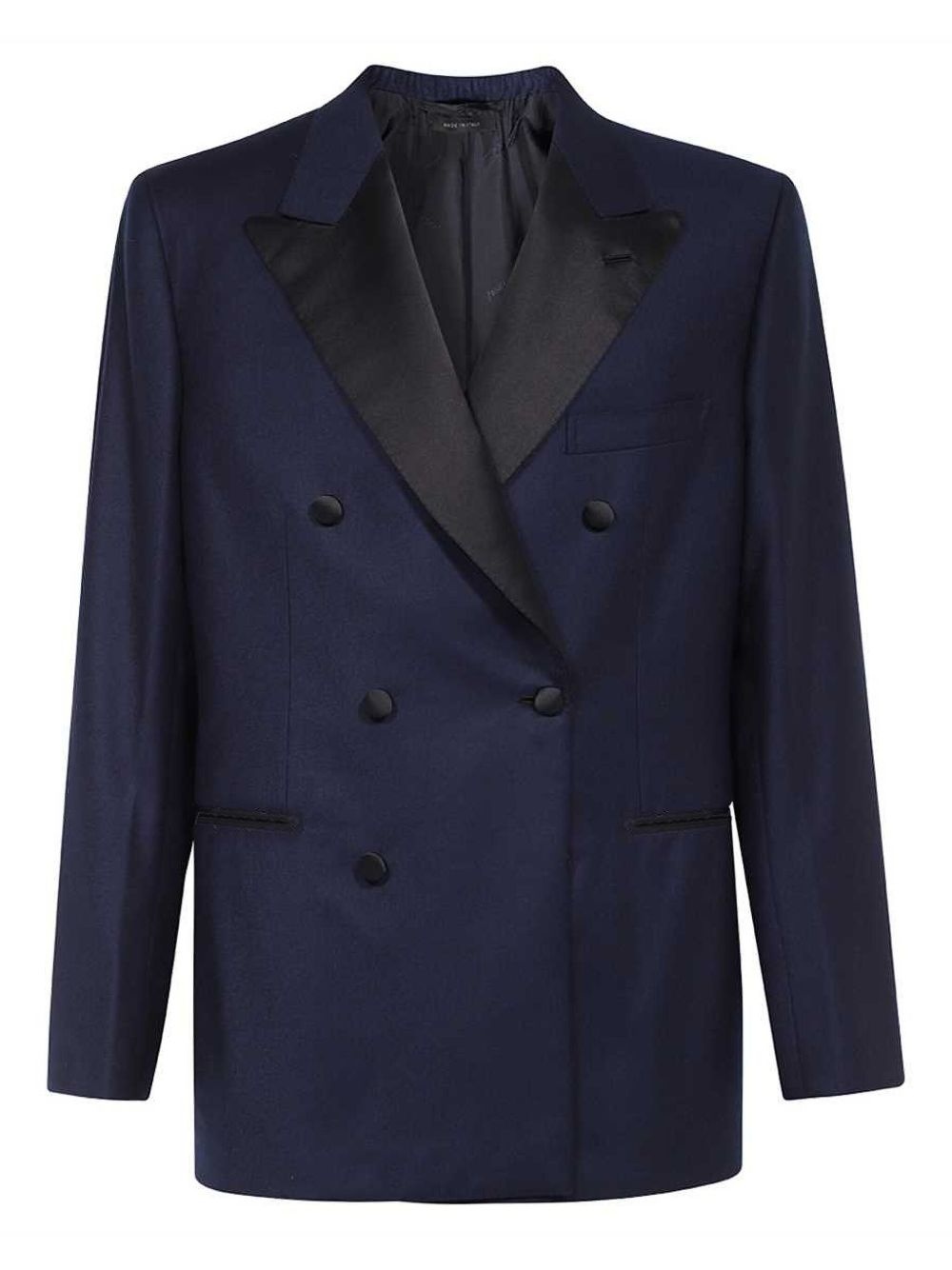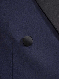 satin-lapels blazer Highlights - Navy blue - Double-breasted button fastening - Chest welt pocket - Two side slit pockets - English rear vents Made in Italy Composition Outer: Cotton 100%, Silk 100%, Virgin Wool 100% Lining: Cotton 100%, Cupro 100%