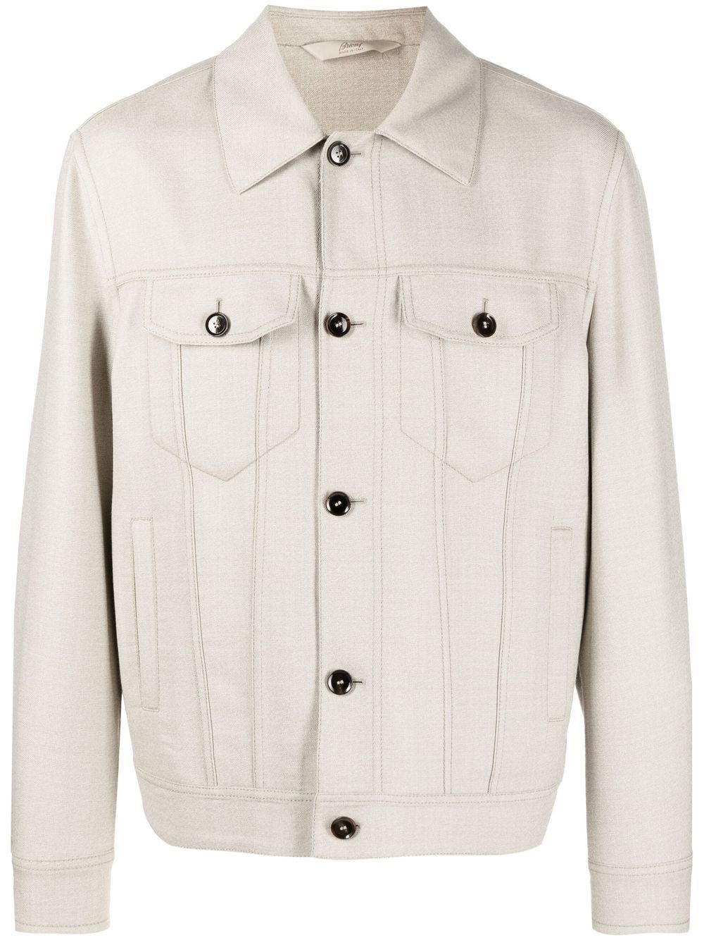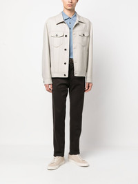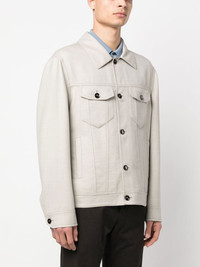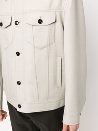 Trucker shirt jacket beige virgin wool blend tonal stitching classic collar front button fastening long sleeves buttoned cuffs two button-fastening chest pockets two side welt pockets Made in Italy Composition Cupro 100%, Cotton 100%, Virgin Wool 99%, Polyamide 1% SIZE & FIT Model measurements Height 6 ft 1 in(1.85 m) Bust/Chest 35.82 in(91 cm) Hips 37.79 in(96 cm) Waist 29.13 in(74 cm) Washing instructions Dry Clean Only