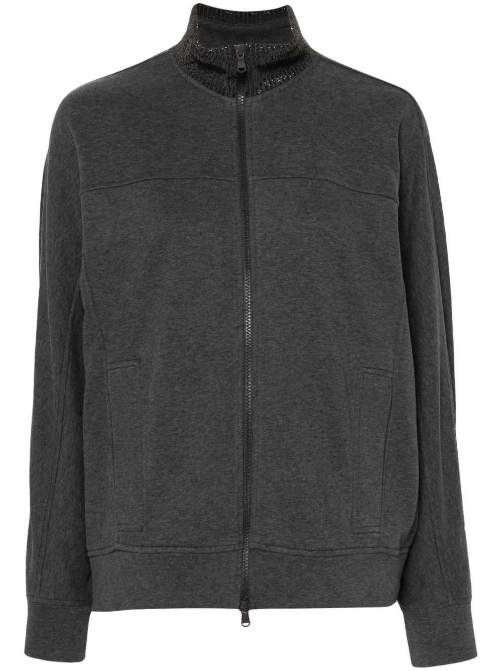 bead-detail cardigan Highlights - Heather grey - Cotton - Jersey texture - Bead detailing - Stand-up collar - Front two-way zip fastening - Long sleeves - Ribbed cuffs and hem - Two front welt pockets - French terry lining Made in Italy Composition Lining: Acetate 74%, Silk 26% Outer: Cotton 100% SIZE & FIT Model measurements Height 5 ft 10 in(1.77 m) Bust/Chest 34.64 in(88 cm) Hips 35.43 in(90 cm) Waist 24.8 in(63 cm) FittingInformation Designed to be unstructured, offering a loose fit throughout Made from a midweight non-stretch fabric, this piece offers minimal elasticity when worn This piece fits true to size – take your usual size Washing instructions Dry Clean Only