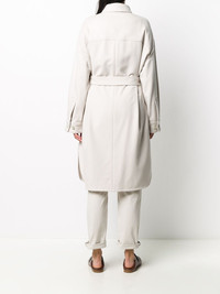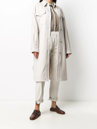 belted denim coat Highlights - White - Silk/cahsmere/ wool - Tied waist - Classic collar - Front button fastening - Long sleeves - Two chest flap pockets - Mid-length Made in Italy Composition Lining: Acetate 74%, Silk 26% Outer: Wool 96%, Cashmere 4% SIZE & FIT Model measurements Height 5 ft 10 in(1.78 m) Bust/Chest 33.07 in(84 cm) Hips 35.82 in(91 cm) Waist 25.98 in(66 cm) FittingInformation This piece fits true to size. We recommend you get your regular size Cut for a loose fit. Comes with an adjustable belt for a flexible fit at the waist Made with a mid-weight non-stretch fabric Washing instructions Dry Clean Only