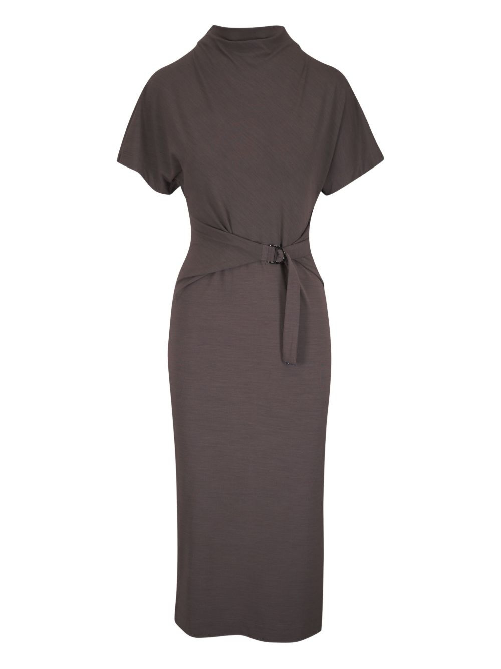 belted short-sleeve midi dress Highlights - Brown - Short sleeves - Belted waist - Mock neck Made in United States Composition Fabric 100% Washing instructions Read Manufacturer Guidelines