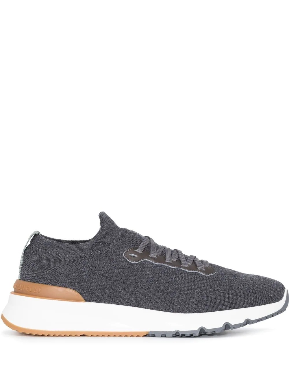 knitted low-top sneakers Brunello Cucinelli translates its knitwear knowledge into contemporary footwear with pieces such as this low-top pair. It has an understated casual silhouette, with a lightweight upper knitted from wool mesh. Made in Italy Composition Outer: Fabric 100%, Leather 100% Lining: Leather 100%, Fabric 100% Sole: Rubber 100% SIZE & FIT Model measurements Height 6 ft 2 in(1.87 m) Bust/Chest 38.18 in(97 cm) Hips 36.61 in(93 cm) Waist 29.13 in(74 cm) FittingInformation This piece fits true to size. We recommend you get your regular size Measurement HEEL 1.77 in(4.5 cm) Sole height 0.9 in(2.3 cm)
